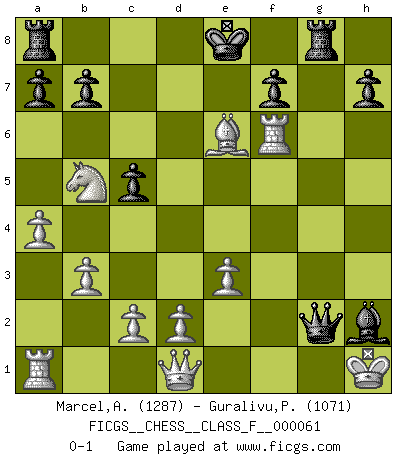 Last move : 0-1 2008 June 11 17:12:53 [Event "FICGS__CHESS__CLASS_F__000061"] [Site "FICGS"] [Date "2008.05.29"] [Round "1"] [White "Marcel,Alexis"] [Black "Guralivu,Paul-Iosif"] [Result "0-1"] [WhiteElo "1287"] [BlackElo "1071"] 1.f4 c5 2.Nf3 d6 3.e3 Nc6 4.Be2 e5 5.fxe5 Nxe5 6.O-O Nf6 7.b3 Qc7 8.Bb2 Be7 9.Nc3 d5 10.a4 Bd6 11.Nb5 Nxf3+ 12.Bxf3 Bxh2+ 13.Kh1 Qg3 14.Bxf6 gxf6 15.Bxd5 Rg8 16.Rxf6 Be6 17.Bxe6 Qxg2+ 0-1 Bird's Opening Kingside Castling by player White (move 6) Player Black won this chess game. Follow this game move after move (download)Could we look into the head of a Chess player, we should see there a whole world of feelings, images, ideas, emotion and passion. (Alfred Binet) Der zweitbeste Zug ist oft der einzig richtige. (Savielly Grigorievitsch Tartakower) Si tu oponente te ofrece un empate, trata de averiguar porque piensa él que esta en una posición peor. (Nigel Short) Si rien de grave n'est détecté lors de l'analyse d'une position, on joue alors le coup. Seconde règle de Blumenfeld. Go and wake up your luck. (Persian saying)