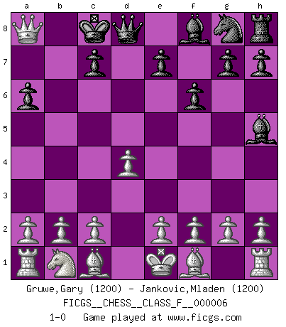 Last move : 1-0 2006 September 19 17:16:49 [Event "FICGS__CHESS__CLASS_F__000006"] [Site "FICGS"] [Date "2006.07.19"] [Round "1"] [White "Gruwe,Gary"] [Black "Jankovic,Mladen"] [Result "1-0"] [WhiteElo "1200"] [BlackElo "1200"] 1.d4 d5 2.Nf3 Bg4 3.Ne5 Bh5 4.Qd3 Nd7 5.Qb5 a6 6.Qxb7 f6 7.Nxd7 Kxd7 8.Qxd5 Kc8 9.Qxa8 1-0 Queen's pawn game Player White won this chess game. Follow this game move after move (download)Good positions don't win games, good moves do. (Gerald Abrahams) Modernes Schach erfordert enorme Anspannung. Es ist für einen normalen Menschen unmöglich das auszuhalten. (Viktor Kortschnoi) El juego de Damas es para vagabundos. (Paul Morphy) Toute estimation doit être constamment réévaluée. (Jacob Estrin) For peace of mind, resign as general manager of the universe. (Douglas Adams)