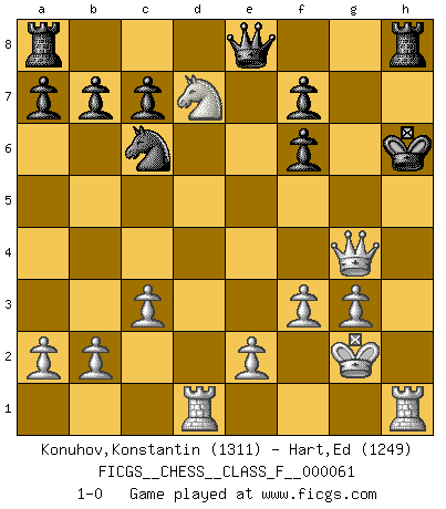 Last move : 1-0 2008 July 2 18:45:42 [Event "FICGS__CHESS__CLASS_F__000061"] [Site "FICGS"] [Date "2008.05.29"] [Round "1"] [White "Konuhov,Konstantin"] [Black "Hart,Ed"] [Result "1-0"] [WhiteElo "1311"] [BlackElo "1249"] 1.d4 d5 2.f3 e6 3.c3 h6 4.Be3 Bd7 5.Nh3 Nc6 6.g3 e5 7.Bg2 Nf6 8.O-O Qc8 9.dxe5 Bxh3 10.exf6 gxf6 11.Qxd5 h5 12.Nd2 Bd6 13.Ne4 Bxg2 14.Kxg2 Be7 15.Bc5 Bxc5 16.Nxc5 h4 17.Rad1 hxg3 18.Qe4+ Kf8 19.Nd7+ Kg7 20.Qg4+ Kh6 21.hxg3 Qe8 22.Rh1+ 1-0 Queen's pawn game Kingside Castling by player White (move 8) Player White won this chess game. Follow this game move after move (download)That's what Chess is all about. One day you give your opponent a lesson, the next day he gives you one. (Bobby Fischer) Karpov ist ein Museumsstück. (Garry Kasparov) Cuando me preguntan: -¿Cual es el secreto que te hace hacer mejores movidas que tus oponentes?, Yo respondo: Me da gusto que me pregunten eso, porque, como veran, hay una simple razón. Yo pienso mis propias movidas y dejo a mi oponente que el piense las suyas. (Alexander Alekhine) Nous vivons dans un monde échiquéen : chaque jour qui passe est un défi à relever. (Philosophe Sasha) Art is not a thing, it is a way. (Elbert Hubbard)