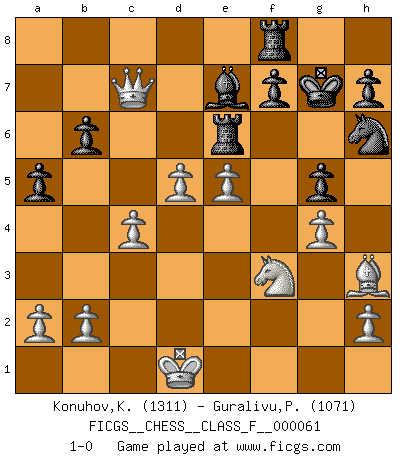 Last move : 1-0 2008 June 16 21:42:39 [Event "FICGS__CHESS__CLASS_F__000061"] [Site "FICGS"] [Date "2008.05.29"] [Round "1"] [White "Konuhov,Konstantin"] [Black "Guralivu,Paul-Iosif"] [Result "1-0"] [WhiteElo "1311"] [BlackElo "1071"] 1.e4 c5 2.f4 e5 3.fxe5 Qh4+ 4.g3 Qxe4+ 5.Qe2 Qxh1 6.Nf3 b6 7.d3 Bb7 8.Nbd2 Bxf3 9.Nxf3 Nc6 10.Be3 Nd4 11.Bxd4 cxd4 12.O-O-O Nh6 13.Qe4 Rd8 14.Bh3 Qxd1+ 15.Kxd1 Bc5 16.Nxd4 O-O 17.Nf3 Rfe8 18.Qa4 a5 19.d4 Bf8 20.Bxd7 Re7 21.Bh3 g5 22.g4 Kg7 23.Qc6 Re6 24.Qc7 Be7 25.c4 Rf8 26.d5 1-0 Comment by player 2 : Paul-Iosif Guralivu : Hello... The score between us is 1-1 Good luck. Sicilian : Grand Prix attack Queenside Castling by player White (move 12) Kingside Castling by player Black (move 16) Player White won this chess game. Follow this game move after move (download)When you don't know what to play, wait for an idea to come into your opponent's mind. You may be sure that idea will be wrong. (Siegbert Tarrasch) Ich kämpfe solange mein Gegner einen Fehler machen kann. (Emanuel Lasker) Bobby es el jugador de Ajedrez mas fino que este país jamás haya producido. Su memoria para las movidas, su brillantez en soñar combinaciones y su feróz determinación por la victoria son algo extraño. (John Collins) Assurément je connaissais par expérience le mystérieux attrait de ce jeu royal, le seul entre tous les jeux inventés par les hommes qui échappe souverainement à la tyrannie du hasard, le seul où l'on ne doive sa victoire qu'à son intelligence ou plutôt à une certaine forme d'intelligence. Mais n'est-ce pas déjà le limiter injurieusement que d'appeler les échecs un jeu ? N'est-ce pas une science, un art ou quelque chose qui, comme le cercueil de Mahomet entre ciel et terre, est suspendu entre l'un et l'autre, et qui réunit un nombre incroyable de contraires ? [...] C'est une pensée qui ne mène à rien, une mathématique qui n'établit rien, un art qui ne laisse pas d'uvre, une architecture sans matière; et il l'a prouvé néanmoins qu'il était plus durable, à sa manière, que les livres ou que tout autre monument, ce jeu unique qui appartient à tous les peuples et à tous les temps, et dont personne ne sait quel dieu en fit don à la terre pour tuer l'ennui, pour aiguiser l'esprit et stimuler l'âme. Où commence-t-il, où finit-il ? (Stefan Zweig) The Internet is the world's largest library. It's just that all the books are on the floor. (John Allen Paulos)