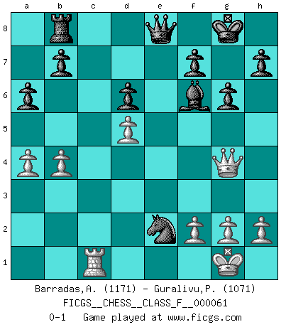 Last move : 0-1 2008 July 9 18:30:42 [Event "FICGS__CHESS__CLASS_F__000061"] [Site "FICGS"] [Date "2008.05.29"] [Round "1"] [White "Barradas,Anderson"] [Black "Guralivu,Paul-Iosif"] [Result "0-1"] [WhiteElo "1171"] [BlackElo "1071"] 1.e4 c5 2.Nf3 d6 3.d4 cxd4 4.Nxd4 Nf6 5.Nc3 a6 6.Bd3 e5 7.Nf3 Nc6 8.Bg5 Be7 9.Bxf6 Bxf6 10.Nd5 Be6 11.O-O O-O 12.c3 Bxd5 13.exd5 Ne7 14.c4 Rb8 15.a4 Ng6 16.b4 e4 17.Ra3 exf3 18.Qxf3 Re8 19.Be4 Ne5 20.Qf5 g6 21.Qf4 Nxc4 22.Ra2 Bg5 23.Qg3 Nd2 24.Re1 Nxe4 25.Qg4 Nc3 26.Rxe8+ Qxe8 27.Ra1 Bf6 28.Rc1 Ne2+ 0-1 Sicilian : Najdorf Kingside Castling by player White (move 11) Kingside Castling by player Black (move 11) Player Black won this chess game. Follow this game move after move (download)Methodical thinking is of more use in Chess than inspiration. (C. J. S. Purdy) Schon mancher Spieler hat aufgegeben, um zu vermeiden, daß er eine Figur verliert. (Savielly Grigorievitsch Tartakower) El jugador táctico sabe que hacer cuando hay algo que hacer; mientras que el estratega sabe que hacer cuando no hay nada que hacer. (Gerald Abrahams) Vouloir jouer aux échecs contre soi-même est aussi paradoxal que vouloir marcher sur son ombre. (Stefan Zweig) Indecision is the key to flexibility. (Unknown)