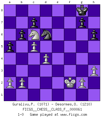 Last move : 1-0 2008 December 5 22:50:55 [Event "FICGS__CHESS__CLASS_F__000061"] [Site "FICGS"] [Date "2008.05.29"] [Round "1"] [White "Guralivu,Paul-Iosif"] [Black "Desormes,Olivier"] [Result "1-0"] [WhiteElo "1071"] [BlackElo "1210"] 1.e4 e6 2.d4 d5 3.Nc3 dxe4 4.Nxe4 Nd7 5.Nf3 Ngf6 6.Bg5 Be7 7.Bd3 Nxe4 8.Bxe7 Qxe7 9.Bxe4 Nf6 10.Bd3 O-O 11.O-O b6 12.c4 Bb7 13.Ne5 Nd7 14.Qc2 h6 15.Ng4 Qg5 16.h3 Nf6 17.f4 Qh4 18.Ne5 Rad8 19.Rad1 Kh8 20.Be2 Qg3 21.Bf3 Bxf3 22.Rxf3 Qh4 23.Nc6 Ra8 24.Qa4 a5 25.Ne5 Rad8 26.Qc6 Rc8 27.f5 Qe4 28.fxe6 Qxc6 29.Nxc6 fxe6 30.Re1 Rfe8 31.Rfe3 Kg8 32.Rxe6 Rxe6 33.Rxe6 Re8 34.Rxe8+ Nxe8 35.Kf2 Nd6 36.c5 1-0 French : Rubinstein variation Kingside Castling by player Black (move 10) Kingside Castling by player White (move 11) Player White won this chess game. Follow this game move after move (download)On the chessboard, lies and hypocrisy do not survive long. (Emanuel Lasker) Wir können eben der zündenden Macht des Opfers nicht wiederstehen, denn die Begeisterung für das Opfer liegt in der Natur des Menschen. (Rudolf Spielmann) Yo considero que Fischer es uno de los expertos mas grandes de aperturas de siempre. (Keith Hayward) Toute estimation doit être constamment réévaluée. (Jacob Estrin) In theory there is no difference between theory and practice. In practice there is. (Yogi Berra)