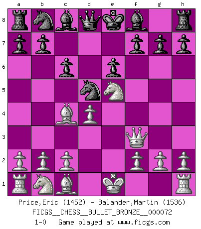Last move : 1-0 2009 February 24 3:50:44 [Event "FICGS__CHESS__BULLET_BRONZE__000072"] [Site "FICGS"] [Date "2009.02.24"] [Round "1"] [White "Price,Eric"] [Black "Balander,Martin"] [Result "1-0"] [WhiteElo "1452"] [BlackElo "1536"] 1.e4 Nf6 2.e5 Nd5 3.d4 d6 4.Nf3 dxe5 5.Nxe5 c6 6.Bc4 e6 7.Qf3 1-0 This chess game has been lost on time (started : 2009.02.24 0:47:20) Alekhine's defense : Modern, Larsen variation Player White won this chess game. Follow this game move after move (download)It is difficult to play against Einstein's theory --on his first loss to Fischer. (Mikhail Tal) Ich bin Weltmeister und muß mit niemandem irgend etwas diskutieren. (Viswanathan Anand) Por la belleza de sus partidas, la claridad de su juego y lo brillante de sus ideas, Fischer se creó el mismo como un artista de la misma estatura como Brahms, Rembrandt y Shakespeare. (David Levy) Ce n'est pas pour s'amuser qu'il joue aux échecs : il célèbre un culte. (Vladimir Nabokov) You can only get smarter by playing a smarter opponent. (Revolver, movie)