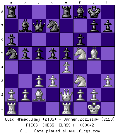 Last move : 0-1 2008 November 1 19:27:59 [Event "FICGS__CHESS__CLASS_A__000042"] [Site "FICGS"] [Date "2008.05.30"] [Round "1"] [White "Ould Ahmed,Samy"] [Black "Sanner,Zdzislaw"] [Result "0-1"] [WhiteElo "2105"] [BlackElo "2120"] 1.e4 e5 2.Nf3 Nc6 3.Bb5 a6 4.Ba4 Nf6 5.O-O b5 6.Bb3 Be7 7.Re1 O-O 8.h3 Bb7 9.d3 d6 10.c3 Na5 11.Bc2 c5 12.Nbd2 Qc7 13.Nf1 Rfe8 14.Ng3 Bf8 15.Bg5 Nd7 16.Nf5 d5 17.Qe2 f6 0-1 This chess game has been lost on time (started : 2008.05.30 7:40:25) Ruy Lopez : 5.O-O Kingside Castling by player White (move 5) Kingside Castling by player Black (move 7) Player Black won this chess game. Follow this game move after move (download)You can only get good at Chess if you love the game. (Bobby Fischer) Ich kenne Menschen, die allen Willen der Welt besitzen und doch nicht Schach spielen können. (Robert James Fischer) Morphy probablemente fue el genio más grande de todos. (Bobby Fischer) Vous savez, camarade Pachman, je n'éprouve pas de plaisir à être ministre, je jouerais plutôt aux échecs comme vous, ou alors ferais une révolution au Venezuela. (Che Guevara à Ludek Pachman, 'Checkmate in Prague', 1975) The message for business people contemplating their place in the cyberspace is simple and direct: get linked or get lost. (Vic Sussman and Kenan Pollack)