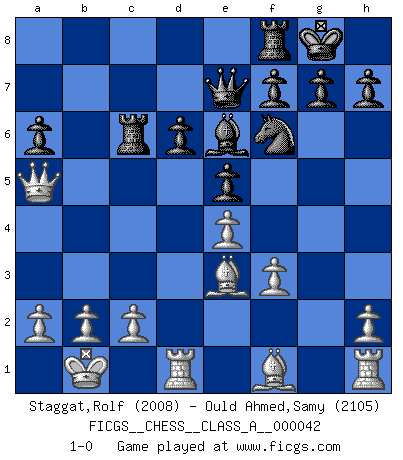 Last move : 1-0 2008 November 2 19:35:40 [Event "FICGS__CHESS__CLASS_A__000042"] [Site "FICGS"] [Date "2008.05.30"] [Round "1"] [White "Staggat,Rolf"] [Black "Ould Ahmed,Samy"] [Result "1-0"] [WhiteElo "2008"] [BlackElo "2105"] 1.e4 c5 2.Nf3 d6 3.d4 cxd4 4.Nxd4 Nf6 5.Nc3 a6 6.Be3 e5 7.Nb3 Be6 8.f3 Be7 9.Qd2 O-O 10.O-O-O Nbd7 11.g4 b5 12.g5 b4 13.gxf6 bxc3 14.Qxc3 Nxf6 15.Na5 Rc8 16.Nc6 Qd7 17.Nxe7+ Qxe7 18.Qa5 Rc6 19.Kb1 1-0 This chess game has been lost on time (started : 2008.05.30 7:40:25) Sicilian : Najdorf, Byrne (English) attack Kingside Castling by player Black (move 9) Queenside Castling by player White (move 10) Player White won this chess game. Follow this game move after move (download)I like the moment when I break a man's ego. (Bobby Fischer) Ich habe Putins Aufstieg an die Macht beobachtet und seine Politik, die demokratischen Institutionen meines Landes zu zerstören. (Garry Kasparov) Los finales de Peón son del Ajedrez lo que el cesped es del Golf. (Cecil Purdy) Je menace de comprendre la position. (Anonyme) Only sick music makes money today. (Friedrich Nietzsche)