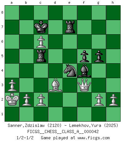 Last move : 1/2-1/2 2008 December 17 13:33:32 [Event "FICGS__CHESS__CLASS_A__000042"] [Site "FICGS"] [Date "2008.05.30"] [Round "1"] [White "Sanner,Zdzislaw"] [Black "Lemekhov,Yura"] [Result "1/2-1/2"] [WhiteElo "2120"] [BlackElo "2025"] 1.e4 c5 2.Nf3 d6 3.d4 cxd4 4.Nxd4 Nf6 5.Nc3 a6 6.Bg5 e6 7.f4 Nbd7 8.Qf3 Qc7 9.O-O-O b5 10.Bd3 Bb7 11.Rhe1 Be7 12.Qg3 b4 13.Nd5 exd5 14.exd5 Kd8 15.Nc6+ Bxc6 16.dxc6 Nc5 17.Bh4 Rg8 18.Bf5 Ra7 19.Qf3 g6 20.Rxd6+ Qxd6 21.Rd1 Kc7 22.Rxd6 Bxd6 23.Bd3 Nh5 24.f5 R7a8 25.Bc4 g5 26.Be1 Bf4+ 27.Kb1 Rge8 28.Bxb4 a5 29.Bxa5+ Rxa5 30.a3 Ne4 31.Qxh5 Rxf5 32.Qh3 R8e5 33.Ka2 h5 34.Qxh5 Re7 35.Qf3 Rc5 36.Bd3 f5 1/2-1/2 Sicilian : Najdorf, 7.f4 Queenside Castling by player White (move 9) This chess game ended in a draw. Follow this game move after move (download)Every Chess master was once a beginner. (Chernev) Vielleicht wirkt die Aura früherer Spieler glanzvoller als die der heutigen Spieler, aber das liegt daran, dass man kein Programm wie Fritz hatte, das einem all die Löcher in ihren Partien zeigt. (Vladimir Kramnik) Aunque la mayoría de la gente disfruta observar las partidas de los grandes Maestros de ataque, algunos de los jugadores mas notables en la historia han sido los jugadores silenciosos posicionales. Lentamente ellos te aplastan despojandote de tu espacio, congestionando tus piezas y dejandote virtualmente sin nada que hacer. (Yasser Seirawan) La conception d'un plan est le processus par lequel un joueur exploite les avantages de sa position tout en s'efforçant d'en réduire au minimum les inconvénients. Afin de garantir le succès, un plan doit toujours se fonder sur un diagnostic objectif des particularités d'une position. La conception d'un plan est d'autant plus difficile que la position est équilibrée, et grandement facilitée lorsqu'il n'existe qu'un seul plan susceptible de répondre aux exigences de la position. (Harry Golombek) Methinks King Thibault should dub Marius Zubac a knight of the square board... I mean table, henceforth addressing him as Sir Marius, and bestow on him a suitable land from the kingdom of FICGS & marry him off to a worthy, fair maiden, lest he slice our heads with his mighty sword in his wrath. (Dinesh De Silva)