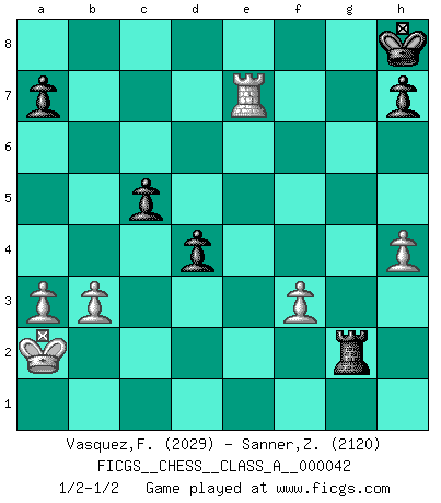 Last move : 1/2-1/2 2008 December 22 1:4:47 [Event "FICGS__CHESS__CLASS_A__000042"] [Site "FICGS"] [Date "2008.05.30"] [Round "1"] [White "Vasquez,Fernando"] [Black "Sanner,Zdzislaw"] [Result "1/2-1/2"] [WhiteElo "2029"] [BlackElo "2120"] 1.e4 e5 2.Nf3 Nc6 3.d4 exd4 4.Nxd4 Nf6 5.Nxc6 bxc6 6.e5 Qe7 7.Qe2 Nd5 8.c4 Ba6 9.Nd2 Nb4 10.Nf3 c5 11.a3 Nc6 12.Bd2 Qe6 13.h4 Be7 14.Bc3 Rb8 15.Rh3 O-O 16.O-O-O f6 17.Rg3 fxe5 18.Nxe5 Nd4 19.Bxd4 cxd4 20.Rxd4 Qh6+ 21.Rd2 Rbe8 22.Rf3 d5 23.Qd3 c6 24.g3 Bf6 25.Ng4 Re1+ 26.Kc2 Qh5 27.Nxf6+ gxf6 28.Bh3 Bxc4 29.Qf5 Qe8 30.b3 Ba6 31.Qg4+ Kh8 32.Qf4 Qe7 33.Kb2 Re4 34.Re3 f5 35.Ka2 Re8 36.Rxe4 fxe4 37.Qe3 Bd3 38.Bg4 Rg8 39.Be2 Bxe2 40.Rxe2 c5 41.f3 d4 42.Qxe4 Qxe4 43.Rxe4 Rxg3 44.Re7 Rg2+ 1/2-1/2 Scotch : Mieses variation Kingside Castling by player Black (move 15) Queenside Castling by player White (move 16) This chess game ended in a draw. Follow this game move after move (download)A man that will take back a move at Chess will pick a pocket. (Richard Fenton) Wenn ich Weiß habe gewinne ich weil ich Weiß habe, wenn ich Schwarz habe gewinne ich weil ich Bogoljubov bin. (Efim Bogoljubov) Si el ingenio solamente fuese necesario para lucirse, las mujeres serían las mejores jugadoras de Ajedrez del mundo. (Albin) Vous m'avez demandé de vous exposer quel est le fondement de la prière. Je ne fais que préparer les pièces du jeu sur la table... Nous sera-t-il permis d'en adopter les règles et si nous les appliquons scrupuleusement nous ne tarderons pas à faire mat le Roi divin ! Il ne pourra échapper à nos mains. (Sainte Thérèse d'Avila, Chemin de perfection) 98% of all statistics are made up. (Author unknown)