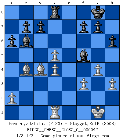 Last move : 1/2-1/2 2009 January 2 2:39:31 [Event "FICGS__CHESS__CLASS_A__000042"] [Site "FICGS"] [Date "2008.05.30"] [Round "1"] [White "Sanner,Zdzislaw"] [Black "Staggat,Rolf"] [Result "1/2-1/2"] [WhiteElo "2120"] [BlackElo "2008"] 1.e4 e5 2.Nf3 Nc6 3.Bc4 Bc5 4.b4 Bxb4 5.c3 Ba5 6.d4 exd4 7.O-O Nge7 8.Ng5 d5 9.exd5 Ne5 10.Bb3 O-O 11.cxd4 Ng4 12.Qf3 Nf6 13.Ba3 h6 14.Ne4 Nxe4 15.Qxe4 Re8 16.Bb2 Nf5 17.Qf4 Qd6 18.Qxd6 Nxd6 19.Bc3 Bb6 20.Na3 Bf5 21.Nc4 Nxc4 22.Bxc4 Rad8 23.Rae1 Re4 24.h3 Rde8 25.Rxe4 Rxe4 26.Rd1 Re8 27.Bb4 Rd8 28.f3 a6 29.g4 1/2-1/2 Evans gambit Kingside Castling by player White (move 7) Kingside Castling by player Black (move 10) This chess game ended in a draw. Follow this game move after move (download)The stomach is an essential part of the Chess master. (Bent Larsen) Kein Großmeister ist normal. Sie unterscheiden sich nur im Ausmaß Ihrer Verrücktheit. (Viktor Kortschnoi) Un sacrificio se refuta mucho mejor al aceptarlo. (Wilhelm Steinitz) Demandez au pauvre Cg1 ce qu'il en pense. Eduard Gufeld à propos de la variante Saemisch de l'Est-Indienne. It is not enough to be a good player... you must also play well. (Siegbert Tarrasch)