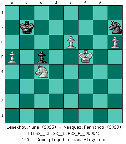 Last move : 1-0 2008 December 13 1:0:49 [Event "FICGS__CHESS__CLASS_A__000042"] [Site "FICGS"] [Date "2008.05.30"] [Round "1"] [White "Lemekhov,Yura"] [Black "Vasquez,Fernando"] [Result "1-0"] [WhiteElo "2025"] [BlackElo "2029"] 1.d4 d5 2.c4 dxc4 3.e4 e5 4.Nf3 exd4 5.Bxc4 Nc6 6.O-O Be6 7.Bxe6 fxe6 8.Qb3 Qd7 9.Ng5 O-O-O 10.Nxe6 Re8 11.Nxf8 Rxf8 12.Rd1 h5 13.Nc3 h4 14.h3 Qf7 15.Qxf7 Rxf7 16.Ne2 Rd7 17.Rb1 Nf6 18.f3 a5 19.Bg5 Rh5 20.Bd2 Rc5 21.Rbc1 Rb5 22.b3 a4 23.b4 a3 24.Rb1 Ne5 25.Rb3 b6 26.Rxa3 d3 27.Nf4 g5 28.Ne6 Nc4 29.Ra8+ Kb7 30.Rf8 Nxd2 31.Rxd2 Nh7 32.Rd8 Re7 33.Rd5 Rxb4 34.Nd8+ Kc8 35.R5xd3 Rb1+ 36.Kh2 Rc1 37.Rd5 Rc5 38.Rxc5 bxc5 39.Nc6 Re6 40.Rd8+ Kb7 41.Na5+ Kb6 42.Ra8 Nf6 43.a4 Nd7 44.Nc4+ Kb7 45.Rg8 Ne5 46.Ne3 c4 47.Rxg5 c6 48.f4 Nd3 49.Nxc4 Nxf4 50.Rg4 Ng6 51.Kg1 Rf6 52.Rg5 Nf4 53.Rf5 Ne2+ 54.Kh2 Re6 55.Rf7+ Kb8 56.e5 c5 57.a5 Nd4 58.g4 hxg3+ 59.Kxg3 Nc6 60.Rf6 Nd4 61.Rxe6 Nxe6 62.h4 Kc7 63.h5 Ng5 64.h6 Kc8 65.Kg4 Nh7 66.Kf5 Kb7 67.e6 1-0 QGA : 3.e4 Kingside Castling by player White (move 6) Queenside Castling by player Black (move 9) 10 pieces endgame at move 59 : White KRNPPP , Black KRNP WHITE : King + 1 Rook 1 Knight 3 Pawns BLACK : King + 1 Rook 1 Knight 1 Pawn 9 pieces endgame at move 61 : White KRNPPP , Black KNP WHITE : King + 1 Rook 1 Knight 3 Pawns BLACK : King + 1 Knight 1 Pawn 8 pieces endgame at move 61 : White KNPPP , Black KNP WHITE : King + 1 Knight 3 Pawns BLACK : King + 1 Knight 1 Pawn Player White won this chess game. Follow this game move after move (download)Chess is a foolish expedient for making idle people believe they are doing something very clever when they are only wasting their time. (George Bernard Shaw) Wer wird heute Abend ihr Gegner sein? -- Heute Abend spiele ich gegen die schwarzen Steine. (Akiba Rubinstein) El Ajedrez es como la guerra en un tablero. (Bobby Fischer) Assurément je connaissais par expérience le mystérieux attrait de ce jeu royal, le seul entre tous les jeux inventés par les hommes qui échappe souverainement à la tyrannie du hasard, le seul où l'on ne doive sa victoire qu'à son intelligence ou plutôt à une certaine forme d'intelligence. Mais n'est-ce pas déjà le limiter injurieusement que d'appeler les échecs un jeu ? N'est-ce pas une science, un art ou quelque chose qui, comme le cercueil de Mahomet entre ciel et terre, est suspendu entre l'un et l'autre, et qui réunit un nombre incroyable de contraires ? [...] C'est une pensée qui ne mène à rien, une mathématique qui n'établit rien, un art qui ne laisse pas d'uvre, une architecture sans matière; et il l'a prouvé néanmoins qu'il était plus durable, à sa manière, que les livres ou que tout autre monument, ce jeu unique qui appartient à tous les peuples et à tous les temps, et dont personne ne sait quel dieu en fit don à la terre pour tuer l'ennui, pour aiguiser l'esprit et stimuler l'âme. Où commence-t-il, où finit-il ? (Stefan Zweig) Good luck. You're gonna need it. (Han Solo in Star Wars ep.6)