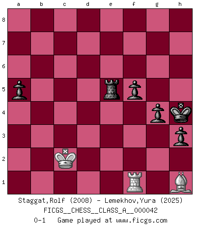 Last move : 0-1 2009 July 21 17:47:47 [Event "FICGS__CHESS__CLASS_A__000042"] [Site "FICGS"] [Date "2008.05.30"] [Round "1"] [White "Staggat,Rolf"] [Black "Lemekhov,Yura"] [Result "0-1"] [WhiteElo "2008"] [BlackElo "2025"] 1.e4 c5 2.Nf3 d6 3.d4 cxd4 4.Nxd4 Nf6 5.Nc3 a6 6.Be3 e5 7.Nb3 Be6 8.Qd2 Be7 9.f3 h5 10.O-O-O Nbd7 11.g3 O-O 12.Kb1 b5 13.Nd5 Bxd5 14.exd5 Nb6 15.f4 Nfxd5 16.Bg2 Nxe3 17.Qxe3 Rc8 18.Bh3 exf4 19.Qf3 Rc4 20.Nd2 Bf6 21.Nxc4 Nxc4 22.c3 b4 23.Qc6 Nxb2 24.Kxb2 bxc3+ 25.Kc2 Qa5 26.a4 Qb4 27.Bg2 Qb2+ 28.Kd3 Rb8 29.Rhe1 c2 30.Rc1 Qa3+ 31.Ke2 Bc3 32.gxf4 Bxe1 33.Rxe1 g6 34.Be4 Qh3 35.Bxc2 Rc8 36.Qe4 d5 37.Qd3 Qxh2+ 38.Kd1 Qxf4 39.Qxd5 h4 40.Rg1 Kf8 41.Re1 Qg4+ 42.Kc1 Qxa4 43.Qd8+ Rxd8 44.Bxa4 Kg7 45.Rh1 g5 46.Bc2 Rd5 47.Be4 Re5 48.Bd3 a5 49.Bc2 Re2 50.Rh3 Rf2 51.Kd1 f5 52.Ba4 Ra2 53.Bd7 Kg6 54.Bc6 Kh5 55.Rf3 Kg4 56.Kc1 h3 57.Kb1 Re2 58.Rf1 Re5 59.Bh1 Kh4 60.Kc2 g4 0-1 Sicilian : Najdorf, Byrne (English) attack Queenside Castling by player White (move 10) Kingside Castling by player Black (move 11) 10 pieces endgame at move 43 : White KRB , Black KQRPPPP WHITE : King + 1 Rook 1 Bishop BLACK : King + 1 Queen 1 Rook 4 Pawns 9 pieces endgame at move 44 : White KRB , Black KRPPPP WHITE : King + 1 Rook 1 Bishop BLACK : King + 1 Rook 4 Pawns Player Black won this chess game. Follow this game move after move (download)The King is a fighting piece. Use it ! (Wilhelm Steinitz) Ein Teil des Fehlers ist immer korrekt. (Savielly Grigorievitsch Tartakower) Yo no creo en la psicología. Yo creo en las buenas movidas. (Bobby Fischer) Le profane ne songe pas à la somme de jouissance dont il se prive, qui méconnaît ce jeu aux ressources aussi variées que passionnantes. (Jean-Marie Jeanton-Lamarche) It is not titles that honor men, but men that honor titles. (Niccolo Machiavelli)