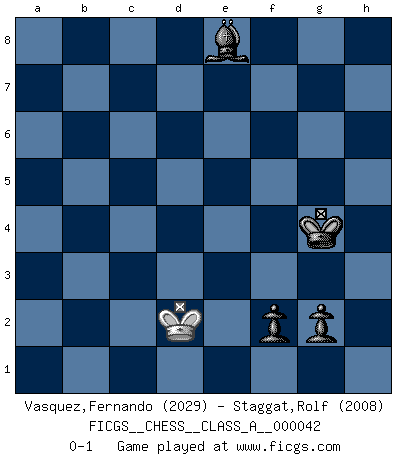 Last move : 0-1 2009 November 10 23:26:43 [Event "FICGS__CHESS__CLASS_A__000042"] [Site "FICGS"] [Date "2008.05.30"] [Round "1"] [White "Vasquez,Fernando"] [Black "Staggat,Rolf"] [Result "0-1"] [WhiteElo "2029"] [BlackElo "2008"] 1.e4 e5 2.Nf3 Nc6 3.d4 exd4 4.Nxd4 Bc5 5.Be3 Qf6 6.c3 Nge7 7.Bc4 Ne5 8.Be2 d5 9.O-O O-O 10.Nd2 Bb6 11.Re1 Rd8 12.g3 c5 13.N4f3 Nxf3+ 14.Bxf3 d4 15.e5 Qg6 16.cxd4 cxd4 17.Bf4 Nd5 18.Be4 Bf5 19.Qf3 Bxe4 20.Nxe4 Nxf4 21.Qxf4 Rac8 22.Rac1 Rxc1 23.Rxc1 d3 24.b3 Qe6 25.Ng5 Qd5 26.Nf3 a5 27.Rd1 Bc5 28.Kg2 b5 29.Qc1 h6 30.h4 Bb4 31.Qe3 Bc3 32.h5 b4 33.g4 d2 34.g5 Qe6 35.Qe4 a4 36.bxa4 Qxa2 37.Qh4 Qd5 38.Qg4 Qe6 39.Qh4 hxg5 40.Qxg5 Rd7 41.a5 b3 42.a6 Qxa6 43.Qg4 Qe6 44.Qe4 Qb6 45.Qc4 Ba5 46.Qa4 Qe6 47.Kg3 Rd3 48.Qe4 Qd5 49.Qxd5 Rxd5 50.Nxd2 Rxd2 51.Rxd2 Bxd2 52.Kf3 b2 53.Ke2 Bc1 54.Kd3 Kh7 55.Kc2 Kh6 56.f4 b1B+ 57.Kxc1 Kxh5 58.Kd2 Kg4 59.Ke1 Kxf4 60.e6 f6 61.Kf2 g5 62.Ke2 g4 63.Kd2 g3 64.e7 Bg6 65.Ke2 Kg4 66.Ke3 f5 67.Ke2 f4 68.Kf1 f3 69.Ke1 f2+ 70.Kd2 g2 71.e8Q Bxe8 0-1 Scotch game Kingside Castling by player White (move 9) Kingside Castling by player Black (move 9) 10 pieces endgame at move 51 : White KRPPP , Black KBPPP WHITE : King + 1 Rook 3 Pawns BLACK : King + 1 Bishop 3 Pawns 9 pieces endgame at move 51 : White KPPP , Black KBPPP WHITE : King + 3 Pawns BLACK : King + 1 Bishop 3 Pawns Promotion Bishop by player Black (move 56) 8 pieces endgame at move 57 : White KPPP , Black KBPP WHITE : King + 3 Pawns BLACK : King + 1 Bishop 2 Pawns 7 pieces endgame at move 57 : White KPP , Black KBPP WHITE : King + 2 Pawns BLACK : King + 1 Bishop 2 Pawns 6 pieces endgame at move 59 : White KP , Black KBPP WHITE : King + 1 Pawn BLACK : King + 1 Bishop 2 Pawns Promotion Queen by player White (move 71) 5 pieces endgame at move 71 : White K , Black KBPP WHITE : King + BLACK : King + 1 Bishop 2 Pawns Player Black won this chess game. Follow this game move after move (download)Any material change in a position must come about by mate, a capture, or a Pawn promotion. (Purdy) Es hat in meinem Leben Zeiten gegeben, da ich sehr nahe daran war zu glauben, daß ich auch nicht eine einzige Schachpartie verlieren könnte. (José Raúl Capablanca) En manos de Fischer's, una diminuta ventaja teórica es tan buena como tener una Reina de ventaja. (Isaac Kashdan) Dans le domaine de la peinture, de la gravure et de la sculpture, dès la première décennie de notre siècle, les artistes abandonnent la représentation de la partie d'échecs pour se concentrer sur les pièces, sur les échiquiers et sur toutes les variations auxquelles les unes et les autres peuvent donner lieu. On passe en quelque sorte d'un thème social à un thème musical (au sens de la musica médiévale, c'est-à-dire d'une notion qui inclue le rythme, l'harmonie, la construction et la déconstruction, etc.). Graphiquement et picturalement, l'échiquier apparaît comme une structure ouverte, dynamique, d'une richesse infinie, autorisant toutes les combinatoires et débouchant sur des mouvements et des rythmes de nature exponentielle. (Michel Pastoureau) Creativity is inventing, experimenting, growing, taking risks, breaking rules, making mistakes, and having fun. (Mary Lou Cook)