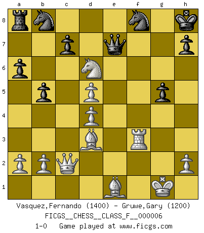 Last move : 1-0 2006 October 14 11:26:20 [Event "FICGS__CHESS__CLASS_F__000006"] [Site "FICGS"] [Date "2006.07.19"] [Round "1"] [White "Vasquez,Fernando"] [Black "Gruwe,Gary"] [Result "1-0"] [WhiteElo "1400"] [BlackElo "1200"] 1.e4 d5 2.exd5 Nf6 3.d4 Bg4 4.f3 Bf5 5.c4 e6 6.Qb3 b6 7.g4 Bxb1 8.Rxb1 exd5 9.g5 Nfd7 10.cxd5 Be7 11.Nh3 O-O 12.Bd3 Re8 13.O-O Bd6 14.Qa4 Re7 15.Nf2 a6 16.f4 b5 17.Qc2 Kh8 18.Ng4 Qe8 19.Rf3 Qg8 20.Bd2 Nf8 21.f5 f6 22.Re1 Rxe1+ 23.Bxe1 fxg5 24.f6 gxf6 25.Nxf6 Qg7 26.Ne8 Qe7 27.Nxd6 1-0 Comment by player 2 : Gary Gruwe : congratulation has YOUR COMPUTOR!!!!!! Scandinavian defense Kingside Castling by player Black (move 11) Kingside Castling by player White (move 13) Player White won this chess game. Follow this game move after move (download)To avoid losing a piece, many a person has lost the game. (Savielly Tartakover) Wer wird heute Abend ihr Gegner sein? -- Heute Abend spiele ich gegen die schwarzen Steine. (Akiba Rubinstein) a manera como él juega al Ajedrez, demuestra la completa naturaleza de un hombre. (Stanley Ellin) Horreur, mais aussi harmonie suprême : qu'y avait-il en effet au monde en dehors des échecs ? Le brouillard, l'inconnu, le non-être... (Vladimir Nabokov) There is no vagueness without wind. (Chinese proverb)