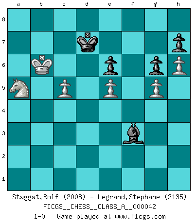Last move : 1-0 2009 September 2 8:29:19 [Event "FICGS__CHESS__CLASS_A__000042"] [Site "FICGS"] [Date "2008.05.30"] [Round "1"] [White "Staggat,Rolf"] [Black "Legrand,Stephane"] [Result "1-0"] [WhiteElo "2008"] [BlackElo "2135"] 1.e4 c5 2.Nf3 d6 3.d4 cxd4 4.Nxd4 Nf6 5.Nc3 Nc6 6.Bg5 e6 7.Qd2 Be7 8.O-O-O O-O 9.f4 d5 10.e5 Nd7 11.Bxe7 Qxe7 12.Nf3 Rd8 13.h4 Nc5 14.h5 b6 15.h6 g6 16.Qe3 Bb7 17.Nb5 Ne4 18.Nd2 a6 19.Nd4 Qc7 20.N2b3 Na5 21.Bd3 Nc4 22.Bxc4 dxc4 23.Nd2 Nxd2 24.Rxd2 b5 25.c3 Rd5 26.Rhd1 Qe7 27.g4 a5 28.f5 b4 29.fxg6 fxg6 30.Rf2 bxc3 31.bxc3 Rb8 32.R1d2 Rd7 33.Nb5 Rxd2 34.Qxd2 Bd5 35.a4 Rf8 36.Nd6 Qd8 37.Rf4 Bc6 38.Qe3 Qe7 39.Kb2 Bxa4 40.Rxf8+ Qxf8 41.Qa7 Bc6 42.g5 a4 43.Ka3 Bf3 44.Qd7 Bg4 45.Kxa4 Kh8 46.Qe8 Kg8 47.Qxf8+ Kxf8 48.Kb4 Be2 49.Nxc4 Ke7 50.Kc5 Bf3 51.Kb6 Kd7 52.Na5 Be4 53.c4 Bf3 54.c5 1-0 Sicilian : Richter-Rauzer, Rauzer attack, 7...Be7 Queenside Castling by player White (move 8) Kingside Castling by player Black (move 8) Player White won this chess game. Follow this game move after move (download)A win by an unsound combination, however showy, fills me with artistic horror. (Wilhelm Steinitz) Kritik überlasse ich den Spießern. Ich zeige nichts, wofür ich mich schämen muss. (Alexandra Kosteniuk) El Peón aislado arroja penumbra sobre todo el tablero. (Aaron Nimzovich) À la honte des hommes, on sait que les lois du jeu sont les seules qui soient partout justes, claires, inviolables et exécutées. Pourquoi l'Indien qui a donné les règles du jeu d'échecs est-il obéi de bon gré dans toute la terre, et que les décrétales des papes, par exemple, sont aujourd'hui un objet d'horreur et de mépris ? C'est que l'inventeur des échecs combina tout avec justesse pour la satisfaction des joueurs, et que les papes, dans leurs décrétales, n'eurent en vue que leur seul avantage. L'Indien voulut exercer également l'esprit des hommes et leur donner du plaisir; les papes ont voulu abrutir l'esprit des hommes. Voltaire (Dictionnaire philosophique / Garnier 1967) Panic is a sudden desertion of us, an a going over to the enemy of our imagination. (Christian Nevell Bovee)