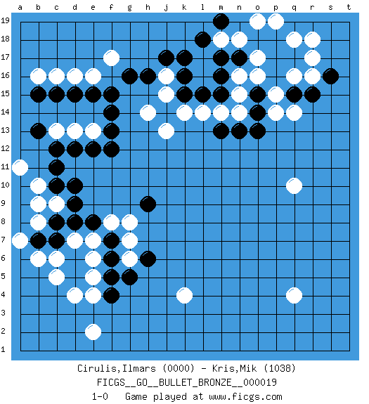 Last move : 1-0 2008 May 30 12:28:15 [Event "FICGS__GO__BULLET_BRONZE__000019"] [Site "FICGS"] [Date "2008.05.30"] [Round "1"] [Black "Cirulis,Ilmars"] [White "Kris,Mik"] [Result "1-0"] [Rating 1 "0000"] [Rating 2 "1038"] 1.d15 d4 2.d5 c5 3.d6 e4 4.f5 c6 5.c7 d7 6.d8 e7 7.c8 e5 8.e8 q4 9.f6 e6 10.f7 q16 11.q15 r16 12.r15 p15 13.p16 o16 14.p17 o17 15.q17 r17 16.o15 p14 17.o18 n18 18.o14 q14 19.s16 r18 20.p18 q18 21.n17 n16 22.m17 p19 23.m16 n15 24.m15 n14 25.o13 m18 26.n13 m14 27.m13 l14 28.l15 k14 29.k15 j15 30.k16 j16 31.l18 q10 32.m19 o19 33.j17 k4 34.k17 e16 35.h16 h14 36.g16 d16 37.e15 c16 38.c15 b16 39.b15 e13 40.f15 c13 41.f14 b6 42.f13 b9 43.e12 d13 44.f12 b8 45.c10 b10 46.c11 f17 47.c12 j13 48.f4 a11 49.b13 e2 50.b7 a7 51.d12 c9 52.d9 f8 53.d10 g8 54.h9 g7 55.h6 g6 56.g5 1-0 Here are the names of the openings (joseki) played in the four corners : Corner d4 : d4 d5 Hoshi (Hwajeom, Seongjeom, Xingwei`) 4-4 Point. The star or hoshi (4-4) point, emphasizing influence at the potential expense of territory. Corner q16 : q16 q15 Hoshi (Hwajeom, Seongjeom, Xingwei`) 4-4 Point. The star or hoshi (4-4) point, emphasizing influence at the potential expense of territory. Corner d16 : d15 j15 Takamoku (Gomok, Gaomu`) 5-4 Point. The takamoku (high) point (5-4). With its emphasis on influence, the 5-4 point complements the 4-4 (hoshi) point in creating an influence-oriented fuseki. Player Black won this Go (weiqi, baduk) game. Follow this game move after move (download)The nature of a game comes from what is played, but it's the sensitivity to the possible and the impossible that gives it value. (Pierre Audouard) Lottery : A tax on people who are bad at math. (Author unknown)