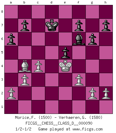 Last move : 1/2-1/2 2008 June 13 11:35:20 [Event "FICGS__CHESS__CLASS_D__000090"] [Site "FICGS"] [Date "2008.05.30"] [Round "1"] [White "Morice,Fabrice"] [Black "Verhaeren,Gertjan"] [Result "1/2-1/2"] [WhiteElo "1500"] [BlackElo "1580"] 1.e4 c5 2.Nf3 e6 3.d4 cxd4 4.Nxd4 Nf6 5.Nc3 d6 6.Be2 Be7 7.O-O O-O 8.Re1 Nc6 9.Be3 Bd7 10.Nxc6 Bxc6 11.f3 a6 12.Kh1 Rc8 13.Qd2 d5 14.exd5 Nxd5 15.Nxd5 Qxd5 16.Qxd5 Bxd5 17.Rac1 Bf6 18.c4 Bc6 19.Rc2 Rfd8 20.b3 Rd7 21.Rd2 Rxd2 22.Bxd2 Rd8 23.Rd1 Kf8 24.Bb4+ Ke8 25.Rxd8+ Kxd8 26.Bd3 g6 27.Kg1 Kd7 28.Kf2 Bd4+ 29.Ke2 Bf6 30.Ke3 e5 31.Be4 Bxe4 32.Kxe4 1/2-1/2 Sicilian : Anderssen variation Kingside Castling by player White (move 7) Kingside Castling by player Black (move 7) This chess game ended in a draw. Follow this game move after move (download)I am still a victim of Chess. It has all the beauty of art and much more. It cannot be commercialized. Chess is much purer than art in its social position. (Marcel Duchamp) Es ist peinlich, dass ich nie Weltmeister wurde. Es wäre leicht, Leonid Breschnjew als Ursache vorzuschieben, dessen Apparat den Vorzeigekommunisten Anatoli Karpow in allem unterstützte. Aber Garri Kasparow zum Beispiel, der ebenfalls von den Sowjets unerwünscht war, hat trotz der Widerstände den WM-Titel erobert. (Viktor Kortschnoi) Si no le temes a Spassky, entonces elimino el elemento del dinero. (Jim Slater) La victoire dans une partie d'Echecs appartient la plupart du temps à celui qui voit un peu plus loin que l'adversaire. (Lasker) You lose, general Kenobi. (General Grievous in Star Wars ep.3)