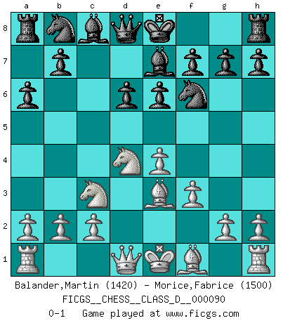 Last move : 0-1 2008 July 10 14:47:39 [Event "FICGS__CHESS__CLASS_D__000090"] [Site "FICGS"] [Date "2008.05.30"] [Round "1"] [White "Balander,Martin"] [Black "Morice,Fabrice"] [Result "0-1"] [WhiteElo "1420"] [BlackElo "1500"] 1.e4 c5 2.Nf3 d6 3.d4 cxd4 4.Nxd4 Nf6 5.Nc3 a6 6.Be3 e6 7.f3 Be7 0-1 This chess game has been lost on time (started : 2008.05.30 17:7:50) Sicilian : Najdorf, Byrne (English) attack Player Black won this chess game. Follow this game move after move (download)Morphy was probably the greatest genius of them all. (Bobby Fischer) Es ist im Leben wie im Schachspiel. Wir entwerfen einen Plan, dieser bleibt jedoch bedingt durch das, was im Schachspiel dem Gegner, im Leben dem Schicksal zu tun belieben wird. (Arthur Schopenhauer) Tu sabes, camarada Pachman, no disfruto el ser un Ministro, preferería jugar al Ajedrez como tu. (Che Guevara) Je menace de comprendre la position. (Anonyme) First of all, we have to go back to the classical time control. (Anatoly Karpov)