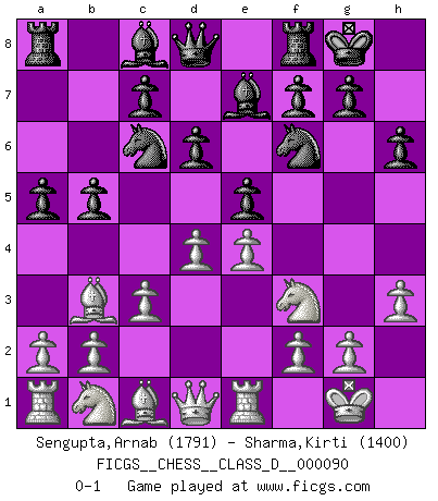 Last move : 0-1 2008 August 8 5:18:8 [Event "FICGS__CHESS__CLASS_D__000090"] [Site "FICGS"] [Date "2008.05.30"] [Round "1"] [White "Sengupta,Arnab"] [Black "Sharma,Kirti"] [Result "0-1"] [WhiteElo "1791"] [BlackElo "1400"] 1.e4 e5 2.Nf3 Nc6 3.Bb5 a6 4.Ba4 Nf6 5.O-O b5 6.Bb3 Be7 7.Re1 O-O 8.c3 d6 9.h3 h6 10.d4 a5 0-1 Ruy Lopez : 5.O-O Kingside Castling by player White (move 5) Kingside Castling by player Black (move 7) Player Black won this chess game. Follow this game move after move (download)Chess is as much a mystery as women. (Purdy) Im Wettkampf zwischen starken Meistern kommen Fehler sehr selten vor, deshalb ist es mit bloßem Warten nicht getan. (José Raúl Capablanca) Tu sabes, camarada Pachman, no disfruto el ser un Ministro, preferería jugar al Ajedrez como tu. (Che Guevara) Je crois qu'il existe des manières très spécifiques de jouer efficacement contre une machine. Evidemment, nous n'avons aucune chance en technique pure, parce que l'ordinateur calcule de manière parfaite. Mais lorsque nous faisons appel à notre cerveau, en utilisant l'intuition et la compréhension, alors nous restons beaucoup plus forts. (Anatoli Karpov) 'preceded by its own quotation yields a falsehood' preceded by its own quotation yields a falsehood. (W. V. O. Quine - Set Theory And Its Logic, 1953)