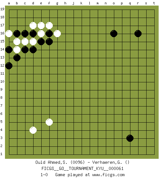 Last move : 1-0 2008 September 12 21:40:44 [Event "FICGS__GO__TOURNAMENT_KYU__000061"] [Site "FICGS"] [Date "2008.05.31"] [Round "1"] [Black "Ould Ahmed,Samy"] [White "Verhaeren,Gertjan"] [Result "1-0"] [Rating 1 "0096"] 1.r16 d4 2.q3 d17 3.f16 f5 4.d16 e16 5.e15 e17 6.c16 f17 7.f15 g16 8.o16 d15 9.d14 c15 10.c14 b15 11.b16 b14 12.b13 a13 13.a12 a16 14.a14 1-0 This go game has been lost on time (started : 2008.05.31 7:28:29) Here are the names of the openings (joseki) played in the four corners : Corner d16 : d17 f16 Komoku (Somok, Xiao~mu`) 3-4 Point. The komoku (3-4) point is the traditional corner enclosure move.. Player Black won this Go (weiqi, baduk) game. Follow this game move after move (download)In opponents' sphere of influence, avoid sharp conflict, don't move too deep. (Otake Hideo, 9p) Establishing goals is all right if you don't let them deprive you of interesting detours. (Doug Larson)