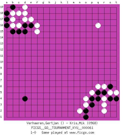 Last move : 1-0 2008 August 1 16:53:17 [Event "FICGS__GO__TOURNAMENT_KYU__000061"] [Site "FICGS"] [Date "2008.05.31"] [Round "1"] [Black "Verhaeren,Gertjan"] [White "Kris,Mik"] [Result "1-0"] [Rating 2 "0968"] 1.d4 q16 2.q4 c16 3.d16 d17 4.e16 e17 5.c15 f16 6.d15 b16 7.b15 f15 8.a16 o3 9.c17 b17 10.c18 b18 11.b19 d18 12.c19 d19 13.a18 a19 14.b19 r6 15.a17 p5 16.c17 c18 17.p4 o4 18.p3 r2 19.o2 n2 20.o1 r4 21.q5 q6 22.r5 s5 23.s4 r3 24.s6 t5 25.t4 1-0 This go game has been lost on time (started : 2008.05.31 7:28:29) Here are the names of the openings (joseki) played in the four corners : Corner d16 : c16 d16 Komoku (Somok, Xiao~mu`) 3-4 Point. The komoku (3-4) point is the traditional corner enclosure move.. Corner q4 : q4 o3 Hoshi (Hwajeom, Seongjeom, Xingwei`) 4-4 Point. The star or hoshi (4-4) point, emphasizing influence at the potential expense of territory. Ikken Kakari (Hankan Keolch'im, Yi Gua`jiao~, 1-Space Low Approach). White 2 is the standard approach move to the 4-4. Player Black won this Go (weiqi, baduk) game. Follow this game move after move (download)Keep sente in the opening. A premature attack loses sente. (Anonymous) The Internet is the first thing that humanity has build that humanity doesn't understand, the largest experiment in anarchy that we have ever had. (Eric Schmidt)