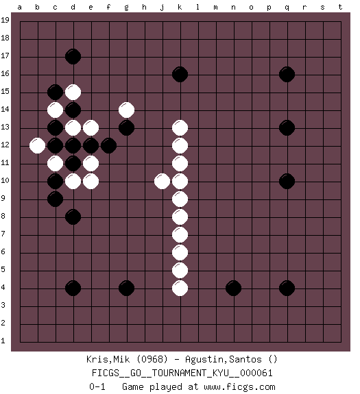Last move : 0-1 2008 July 28 16:33:47 [Event "FICGS__GO__TOURNAMENT_KYU__000061"] [Site "FICGS"] [Date "2008.05.31"] [Round "1"] [Black "Kris,Mik"] [White "Agustin,Santos"] [Result "0-1"] [Rating 1 "0968"] 1.d4 k4 2.q4 k5 3.q16 k6 4.d17 d10 5.c15 k7 6.k16 k8 7.q10 k9 8.d8 k10 9.q13 k11 10.n4 k12 11.d12 k13 12.g4 j10 13.c10 e10 14.c9 c11 15.d11 e11 16.e12 e13 17.f12 d13 18.g13 g14 19.c12 b12 20.c13 c14 21.d14 d15 0-1 This go game has been lost on time (started : 2008.05.31 7:28:29) Here are the names of the openings (joseki) played in the four corners : Player White won this Go (weiqi, baduk) game. Follow this game move after move (download)There are players who don't accept exchange: they play many moves that perpetuate a previous state of the game. (Pierre Audouard) Hold em is to stud what chess is to checkers. (Johnny Moss)