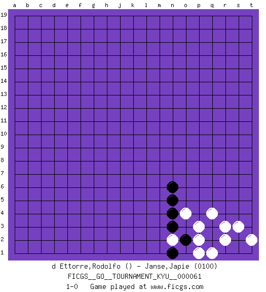 Last move : 1-0 2008 July 13 14:55:47 [Event "FICGS__GO__TOURNAMENT_KYU__000061"] [Site "FICGS"] [Date "2008.05.31"] [Round "1"] [Black "d Ettorre,Rodolfo"] [White "Janse,Japie"] [Result "1-0"] [Rating 2 "0100"] 1.s2 r2 2.q2 s3 3.r1 r3 4.q3 t2 5.s1 p1 6.t1 q1 7.n6 q4 8.n5 p3 9.n4 o4 10.o2 p2 11.n3 n2 12.n1 1-0 This go game has been lost on time (started : 2008.05.31 7:28:29) Here are the names of the openings (joseki) played in the four corners : Corner q4 : s2 r2 This joseki is unknown. A weak or weird move has probably been played in this corner. Player Black won this Go (weiqi, baduk) game. Follow this game move after move (download)There is damezumari at the bamboo joint. (Anonymous) A clear conscience is usually the sign of a bad memory. (Unknown)