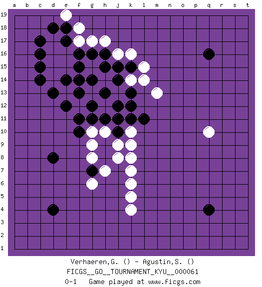 Last move : 0-1 2008 August 30 17:16:31 [Event "FICGS__GO__TOURNAMENT_KYU__000061"] [Site "FICGS"] [Date "2008.05.31"] [Round "1"] [Black "Verhaeren,Gertjan"] [White "Agustin,Santos"] [Result "0-1"] 1.d4 k4 2.c17 k5 3.q16 k6 4.q4 k7 5.d8 k8 6.k15 k10 7.f10 q10 8.k11 k9 9.l11 j11 10.j12 h12 11.k12 j13 12.k13 k14 13.j14 l14 14.h13 h14 15.h11 h10 16.j10 j9 17.g12 l15 18.j11 k16 19.j15 j16 20.h15 g15 21.g14 f14 22.h16 h17 23.g16 g17 24.f15 e15 25.f16 e16 26.e14 e13 27.f13 f12 28.f14 m13 29.e12 f17 30.d13 d14 31.f11 g10 32.h9 g9 33.h8 g8 34.g7 h7 35.g11 j8 36.c14 d15 37.c15 d16 38.e17 d17 39.e18 f18 40.d18 e19 41.c16 g6 0-1 Here are the names of the openings (joseki) played in the four corners : Corner d16 : c17 j11 San-San (Sam-Sam, San-San) 3-3 Point. The San-San (3-3) point, emphasizing territory at the expense of influence. Player White won this Go (weiqi, baduk) game. Follow this game move after move (download)Win the stones, lose the game. (Anonymous) I don't believe in psychology. I believe in good moves. (Bobby Fischer)