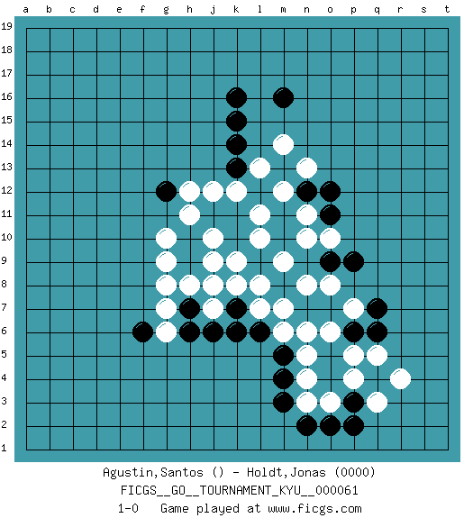 Last move : 1-0 2008 August 31 7:45:6 [Event "FICGS__GO__TOURNAMENT_KYU__000061"] [Site "FICGS"] [Date "2008.05.31"] [Round "1"] [Black "Agustin,Santos"] [White "Holdt,Jonas"] [Result "1-0"] [Rating 2 "0000"] 1.k16 g8 2.k15 o10 3.k14 l10 4.k10 k9 5.k11 j10 6.j11 h11 7.h10 j9 8.g12 h12 9.l9 l11 10.l12 k12 11.m10 j12 12.k13 m9 13.m11 m12 14.m13 l13 15.l8 n10 16.n12 n11 17.m8 n13 18.o12 m14 19.m16 g10 20.h9 h8 21.h7 g9 22.o11 k8 23.k7 n8 24.o9 o8 25.p9 m7 26.n7 l7 27.l6 j7 28.k6 g7 29.h6 j8 30.j6 m6 31.m5 n6 32.o7 o6 33.o5 p7 34.p6 p5 35.q6 n5 36.o4 p4 37.p3 n4 38.q4 o3 39.m4 q5 40.q7 q3 41.p2 r4 42.o2 n3 43.m3 l8 44.n2 g6 45.f6 1-0 This go game has been lost on time (started : 2008.05.31 7:28:29) Here are the names of the openings (joseki) played in the four corners : Corner d16 : j11 h11 This joseki is unknown. A weak or weird move has probably been played in this corner. Corner q16 : l11 l12 This joseki is unknown. A weak or weird move has probably been played in this corner. Corner q4 : l9 m9 This joseki is unknown. A weak or weird move has probably been played in this corner. Player Black won this Go (weiqi, baduk) game. Follow this game move after move (download)Empty triangles are bad. (Anonymous) There will be no order, only chaos. (Sol Robeson in Pi by Darren Aronofsky)