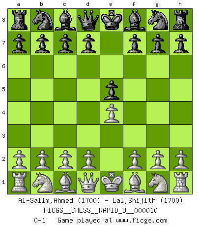 Last move : 0-1 2006 August 22 6:29:44 [Event "FICGS__CHESS__RAPID_B__000010"] [Site "FICGS"] [Date "2006.07.20"] [Round "1"] [White "Al-Salim,Ahmed"] [Black "Lal,Shijith"] [Result "0-1"] [WhiteElo "1700"] [BlackElo "1700"] 1.e4 e5 0-1 This chess game has been lost on time (started : 2006.07.20 22:39:34) King's pawn game Player Black won this chess game. Follow this game move after move (download)The tactician knows what to do when there is something to do; whereas the strategian knows what to do when there is nothing to do. (Gerald Abrahams) Wenn Du einsam bist, wenn Du Dich in der Welt wie ein Fremder fühlst, spiele Schach. Das wird Deinen Geist erheben und Dein Ratgeber im Kampf sein. (Aristoteles) El Ajedrez es tan interesante por sí solo, que no es necesario un interés monetario para persuadir a una persona a que lo practique; por lo tanto, nunca se juega por dinero. (Benjamin Franklin) La conception d'un plan est le processus par lequel un joueur exploite les avantages de sa position tout en s'efforçant d'en réduire au minimum les inconvénients. Afin de garantir le succès, un plan doit toujours se fonder sur un diagnostic objectif des particularités d'une position. La conception d'un plan est d'autant plus difficile que la position est équilibrée, et grandement facilitée lorsqu'il n'existe qu'un seul plan susceptible de répondre aux exigences de la position. (Harry Golombek) Establishing goals is all right if you don't let them deprive you of interesting detours. (Doug Larson)