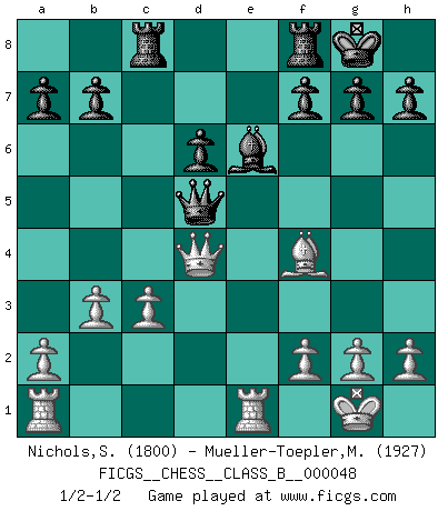 Last move : 1/2-1/2 2008 June 19 10:48:42 [Event "FICGS__CHESS__CLASS_B__000048"] [Site "FICGS"] [Date "2008.06.01"] [Round "1"] [White "Nichols,Scott"] [Black "Mueller-Toepler,Michael"] [Result "1/2-1/2"] [WhiteElo "1800"] [BlackElo "1927"] 1.e4 e5 2.Nf3 Nc6 3.Bc4 Nf6 4.d4 exd4 5.O-O Nxe4 6.Re1 d5 7.Bxd5 Qxd5 8.Nc3 Qh5 9.Nxe4 Be6 10.Bg5 Bd6 11.Nxd6+ cxd6 12.Bf4 Qd5 13.c3 Rc8 14.b3 O-O 15.Nxd4 Nxd4 16.Qxd4 1/2-1/2 Two knights defense Kingside Castling by player White (move 5) Kingside Castling by player Black (move 14) This chess game ended in a draw. Follow this game move after move (download)We must make sure that Chess will not be like a dead language, very interesting, but for a very small group. (Sytze Faber) Ein guter Spieler hat immer Glück. (José Raúl Capablanca) El juego de Damas es para vagabundos. (Paul Morphy) Aux échecs, les retours au sommet sont rares : les dommages psychologiques consécutifs à une défaite sont trop sévères. (Daily Telegraph) The existence of forgetting has never been proved: We only know that some things don't come to mind when we want them. (Friedrich Nietzsche)