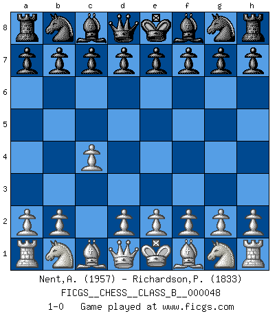 Last move : 1-0 2008 June 3 3:8:40 [Event "FICGS__CHESS__CLASS_B__000048"] [Site "FICGS"] [Date "2008.06.01"] [Round "1"] [White "Nent,Alexander"] [Black "Richardson,Patrick"] [Result "1-0"] [WhiteElo "1957"] [BlackElo "1833"] 1.c4 1-0 English Opening Player White won this chess game. Follow this game move after move (download)You must take your opponent into a deep dark forest where 2+2=5, and the path leading out is only wide enough for one. (Mikhail Tal) Im Blitz ist es einfacher mit einer Figur weniger anzugreifen, als sich mit einer Mehrfigur zu verteidigen. (Mikhail Nekhemyevich Tal) Aquel que ve no otra dirección en el juego que la de dar Jaque Mate a su oponente, nunca será un buen jugador de Ajedrez. (Euwe) Il n'y a pas de prix trop élevé au scalp de l'ennemi. (Koblentz) I'm extremely disappointed. I send you out for exciting, new designer drugs, you come back with tomato sauce. (Gregory House, House M.D.)