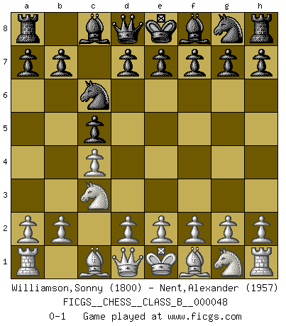 Last move : 0-1 2008 July 13 2:53:55 [Event "FICGS__CHESS__CLASS_B__000048"] [Site "FICGS"] [Date "2008.06.01"] [Round "1"] [White "Williamson,Sonny"] [Black "Nent,Alexander"] [Result "0-1"] [WhiteElo "1800"] [BlackElo "1957"] 1.c4 c5 2.Nc3 Nc6 0-1 This chess game has been lost on time (started : 2008.06.01 15:34:36) English : Symmetrical variation Player Black won this chess game. Follow this game move after move (download)A thorough understanding of the typical mating continuations makes the most complicated sacrificial combinations leading up to them not only not difficult, but almost a matter of course. (Siegbert Tarrasch) Ein Großmeister muß tausende Partien in seinem Kopf speichern, denn diese sind für Ihn, was die Worte der Muttersprache für gewöhnliche Leute sind, oder Noten für Musiker... (Garry Kasparov) Aún el Rey más flojo huye despavorido ante la amenaza de un Jaque doble. (Aaron Nimzowitsch) Les Echecs représentent une sphère d'idées créatrices basée sur la volonté des deux protagonistes. (Smyslov) Gambling : The sure way of getting nothing from something. (Wilson Mizner)