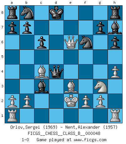 Last move : 1-0 2008 July 28 13:50:56 [Event "FICGS__CHESS__CLASS_B__000048"] [Site "FICGS"] [Date "2008.06.01"] [Round "1"] [White "Orlov,Vladimir"] [Black "Nent,Alexander"] [Result "1-0"] [WhiteElo "1969"] [BlackElo "1957"] 1.e4 c6 2.d4 d5 3.Nc3 dxe4 4.Nxe4 Bf5 5.Ng3 Bg6 6.h4 h6 7.Nh3 Nf6 8.Nf4 Bh7 9.Bc4 e6 10.Qe2 Qxd4 11.Nxe6 fxe6 12.Qxe6+ Kd8 13.Be3 Bb4+ 14.c3 Bxc3+ 15.Ke2 1-0 Caro-Kann : Classical, 6.h4 Player White won this chess game. Follow this game move after move (download)Chess is a sea in which a gnat may drink and an elephant may bathe. (Hindu proverb) Ich möchte Schüler heranbilden, die das Vermögen haben, selbst zu denken und Kritik zu üben. (Emanuel Lasker) Repentinamente, me resultaba obvio en mi analisis que yo había pasado por alto lo que Fischer había visto en el tablero con la mas grande facilidad. (Mikhail Botvinnik) Un footballeur joue avec ses pieds, parfois avec sa tête. Un joueur d'échecs ne joue qu'avec sa tête. Et quand il ne joue plus, il meurt. (Jacob Murray) What doesn't kill us makes us stronger. (Friedrich Nietzsche)