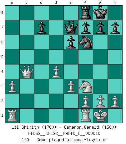 Last move : 1-0 2006 August 12 23:37:38 [Event "FICGS__CHESS__RAPID_B__000010"] [Site "FICGS"] [Date "2006.07.20"] [Round "1"] [White "Lal,Shijith"] [Black "Cameron,Gerald"] [Result "1-0"] [WhiteElo "1700"] [BlackElo "1500"] 1.d4 Nf6 2.c4 e6 3.Nc3 Bb4 4.Qc2 d5 5.Nf3 dxc4 6.e3 b5 7.Bd2 O-O 8.Nxb5 Be7 9.Bxc4 Nc6 10.a3 Rb8 11.O-O Ba6 12.Nxa7 Bxc4 13.Nxc6 Qe8 14.Nxe7+ Qxe7 15.Qxc4 Rxb2 16.Bb4 Rxb4 17.Qxb4 1-0 Nimzo-Indian : Classical, Noa variation Kingside Castling by player Black (move 7) Kingside Castling by player White (move 11) Player White won this chess game. Follow this game move after move (download)There must have been a time when men were demigods, or they could not have invented Chess. (Gustav Schenk) Kann Schach nicht schließlich das Nationalspiel der Deutschen werden? Und welche weiteren Ausblicke bieten sich dann dar! Welche Hebung des allgemeinen Kultur-Niveaus, ja der Moral, wenn das Schachbrett den Kartentisch verdrängen würde! Wahrlich, ein Ziel, des Schweißes der Edlen wert! (Siegbert Tarrasch) Antes de los Finales, los dioses han colocado el Juego Medio. (Siegbert Tarrasch) Il s'avisa de me proposer d'apprendre les échecs qu'il jouait un peu... me voilà forcené des échecs. J'achète un échiquier, je m'enferme dans ma chambre, j'y passe des jours et des nuits à vouloir apprendre par cur toutes les parties. (Jean-Jacques Rousseau, Confessions) Follow your passion, and success will follow you. (Arthur Buddhold)
