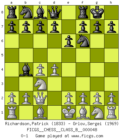 Last move : 0-1 2008 June 8 14:58:12 [Event "FICGS__CHESS__CLASS_B__000048"] [Site "FICGS"] [Date "2008.06.01"] [Round "1"] [White "Richardson,Patrick"] [Black "Orlov,Vladimir"] [Result "0-1"] [WhiteElo "1833"] [BlackElo "1969"] 1.d4 Nf6 2.c4 e6 3.Nc3 Bb4 4.Qc2 O-O 0-1 Nimzo-Indian : Classical variation Kingside Castling by player Black (move 4) Player Black won this chess game. Follow this game move after move (download)The chessboard is the world, the pieces are the phenomena of the Universe, the rules of the game are what we call the laws of Nature and the player on the other side is hidden from us. (Thomas Huxley) Es ist wirklich schade, dass so viele Schachspieler nicht auf ihr Äußeres achten! (Alexandra Kosteniuk) ¿Quién es tu oponente esta tarde? Esta tarde mi oponente son las piezas negras. (Akiba Rubinstein) En blitz, le Cavalier l'emporte sur le Fou. (Vlastimil Hort) He who laughs last probably does not get the joke. (Unknown)