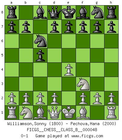 Last move : 0-1 2008 July 14 15:3:1 [Event "FICGS__CHESS__CLASS_B__000048"] [Site "FICGS"] [Date "2008.06.01"] [Round "1"] [White "Williamson,Sonny"] [Black "Pechova,Hana"] [Result "0-1"] [WhiteElo "1800"] [BlackElo "2000"] 1.e4 c5 2.Nf3 Nc6 0-1 This chess game has been lost on time (started : 2008.06.01 15:34:36) Sicilian defense Player Black won this chess game. Follow this game move after move (download)It is peculiar but a fact nevertheless, that gamblers in chess always have enthusiastic followers. (Botvinnik) Ich hatte meine größten Erfolge, als ich 47 Jahre alt war. Kasparow war noch nicht mal 42 und hat das Schach schon im Stich gelassen. (Viktor Kortschnoi) Con o sin el título, Bobby Fischer fue sin lugar a dudas el mas grande jugador de su época. (Burt Hochberg) Mon pion favori sur ma case favorite ! Bronstein en parlant d'un coup de pion en h5 quand il avait les Noirs. Men should grow up. - Yeah. And dogs should stop licking themselves. It's not gonna happen. (Gregory House to Dr. Cameron, House M.D.)
