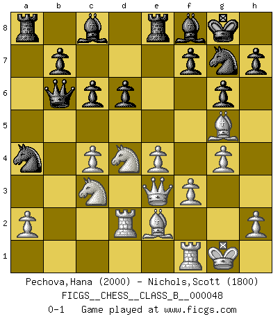Last move : 0-1 2008 November 8 20:15:4 [Event "FICGS__CHESS__CLASS_B__000048"] [Site "FICGS"] [Date "2008.06.01"] [Round "1"] [White "Pechova,Hana"] [Black "Nichols,Scott"] [Result "0-1"] [WhiteElo "2000"] [BlackElo "1800"] 1.d4 Nf6 2.c4 d6 3.Nc3 Nbd7 4.Nf3 g6 5.e4 e5 6.Be2 Bg7 7.O-O exd4 8.Nxd4 O-O 9.f3 c6 10.Be3 Re8 11.Qd2 Qc7 12.Rad1 a5 13.Nc2 Bf8 14.b3 Nc5 15.Bf4 Re6 16.Nd4 Re8 17.Qe3 Nh5 18.Bg5 Qb6 19.Rd2 a4 20.g4 Ng7 21.bxa4 Nxa4 0-1 This chess game has been lost on time (started : 2008.06.01 15:34:36) Old Indian defense Kingside Castling by player White (move 7) Kingside Castling by player Black (move 8) Player Black won this chess game. Follow this game move after move (download)It is not a move, even the best move that you must seek, but a realizable plan. (Eugene Znosko-Borovsky) Ich habe Kasparov in Rente geschickt. (Veselin Topalov) El Ajedrez por encima de todo... ¡es una pelea!. (Emanuel Lasker) Aidez vos pièces, elles vous aideront. (Paul Morphy) The only sure thing about luck is that it will change. (Wilson Mizner)