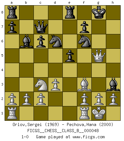 Last move : 1-0 2008 October 17 12:7:5 [Event "FICGS__CHESS__CLASS_B__000048"] [Site "FICGS"] [Date "2008.06.01"] [Round "1"] [White "Orlov,Vladimir"] [Black "Pechova,Hana"] [Result "1-0"] [WhiteElo "1969"] [BlackElo "2000"] 1.e4 e5 2.Nf3 Nc6 3.Bc4 Nf6 4.Ng5 d5 5.exd5 Na5 6.Bb5+ c6 7.dxc6 bxc6 8.Be2 h6 9.Nh3 Bc5 10.O-O O-O 11.d3 Nb7 12.Nc3 Qc7 13.Be3 Bb6 14.Bf3 Nd6 15.Qd2 Re8 16.Bxh6 gxh6 17.Qxh6 Bxh3 18.Qg5+ 1-0 This chess game has been lost on time (started : 2008.06.01 15:34:36) Two knights defense Kingside Castling by player White (move 10) Kingside Castling by player Black (move 10) Player White won this chess game. Follow this game move after move (download)I don't believe in psychology. I believe in good moves. (Bobby Fischer) Es liegt in der Natur, vernüftig zu denken und unlogisch zu handeln. (Anatole France) No hay precio que no valga la pena por la cabellera del Rey enemigo. (Koblentz) La tactique est l'élément le plus important du milieu de jeu. (Siegbert Tarrasch) Thus, what is of supreme importance in war is to attack the enemy's strategy. (Sun Tzu)