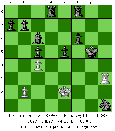 Last move : 0-1 2008 September 6 20:48:12 [Event "FICGS__CHESS__RAPID_E__000002"] [Site "FICGS"] [Date "2008.06.01"] [Round "1"] [White "Melquiades,Jay"] [Black "Belaz,Egidio"] [Result "0-1"] [WhiteElo "0995"] [BlackElo "1200"] 1.e4 c5 2.Nf3 d6 3.h3 Nf6 4.Nc3 e5 5.d3 Be7 6.Bg5 O-O 7.Be2 Nh5 8.Nd5 Bxg5 9.Nxg5 Nf6 10.Nxf6+ Qxf6 11.Nxh7 Kxh7 12.Bg4 Nc6 13.c3 Ne7 14.Bf5+ Nxf5 15.Qe2 Nh4 16.O-O-O Nxg2 17.Rdg1 Nf4 18.Qf3 Be6 19.h4 Bxa2 20.h5 Qh6 21.Qg4 Nxd3+ 22.Kc2 Nxf2 23.Qxg7+ Qxg7 24.Rxg7+ Kxg7 25.h6+ Kh7 26.Rf1 Nxe4 27.Re1 Bd5 28.c4 Bc6 29.Kd3 Nf2+ 30.Ke2 Nh1 31.Rd1 Kxh6 32.Rxd6+ f6 33.Rd3 Rad8 34.Rh3+ Kg5 0-1 This chess game has been lost on time (started : 2008.06.01 16:21:3) Sicilian Kingside Castling by player Black (move 6) Queenside Castling by player White (move 16) Player Black won this chess game. Follow this game move after move (download)Chess is not like life... it has rules ! (Mark Pasternak) Als er Schachweltmeister wurde ließ er praktisch alle stärksten Sovietspieler für sich arbeiten. Wenn ein auch nur mittelmässiger Meister ein Spezialist für eine bestimmte Eröffnung war, wurde er von Karpov gerufen. Das wurde alles geheim gehalten. (Mikhail Moiseyevich Botvinik) No hay precio que sea tan grande por la cabellera del Rey enemigo. (Koblentz) Le moment que je préfère le plus dans une rencontre, c'est celui où je sens que la personnalité de l'adversaire se brise. (Robert Fischer) Knowledge will give you power, but character respect. (Bruce Lee)