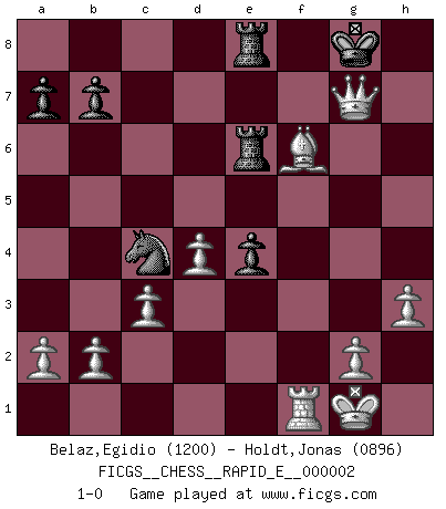 Last move : 1-0 2008 September 1 23:44:36 [Event "FICGS__CHESS__RAPID_E__000002"] [Site "FICGS"] [Date "2008.06.01"] [Round "1"] [White "Belaz,Egidio"] [Black "Holdt,Jonas"] [Result "1-0"] [WhiteElo "1200"] [BlackElo "0896"] 1.e4 c6 2.Nf3 d5 3.exd5 cxd5 4.Bd3 Nf6 5.O-O Bg4 6.Be2 Nc6 7.Re1 e6 8.Nc3 Bd6 9.d3 Qc7 10.Nb5 Qd7 11.Nxd6+ Qxd6 12.Bg5 e5 13.Nd2 Bxe2 14.Rxe2 h6 15.Bh4 O-O 16.c3 Rad8 17.Bg3 Qe6 18.d4 e4 19.f3 Qf5 20.fxe4 Nxe4 21.Nxe4 dxe4 22.Qe1 Rfe8 23.Rf2 Qg4 24.Rf4 Qg6 25.Qe3 Rd7 26.Raf1 Rde7 27.Bh4 f6 28.h3 Na5 29.Rg4 Qf7 30.Bxf6 Nc4 31.Qxh6 Re6 32.Rxg7+ Qxg7 33.Qxg7+ 1-0 Caro-Kann defense Kingside Castling by player White (move 5) Kingside Castling by player Black (move 15) Player White won this chess game. Follow this game move after move (download)If a ruler does not understand Chess, how can he rule over a kingdom ? (King Khusros II) Pläne sind die Träume des Verständigen. (Ernst Freiherr von Feuchtersleben) Aquel que toma al Peón de Caballo de la Reina, se pasará la noche a dormir en la calle. (Anónimo) D'abord les bases : Jouez et étudiez, puis étudiez et jouez, ensuite jouez et étudiez, puis étudiez et jouez. Deuxièmement : Donnez toujours le meilleur de vous-même ! (Ken Smith) If computers get too powerful, we can organize them into committees. That'll do them in. (Anonymous)