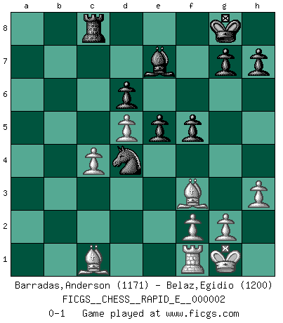 Last move : 0-1 2008 August 20 17:47:12 [Event "FICGS__CHESS__RAPID_E__000002"] [Site "FICGS"] [Date "2008.06.01"] [Round "1"] [White "Barradas,Anderson"] [Black "Belaz,Egidio"] [Result "0-1"] [WhiteElo "1171"] [BlackElo "1200"] 1.e4 c5 2.Nf3 d6 3.d4 cxd4 4.Nxd4 Nf6 5.Nc3 e5 6.Nf3 Be7 7.Bb5+ Bd7 8.O-O O-O 9.Bd3 Nc6 10.a3 a6 11.Be3 b5 12.b4 Bg4 13.h3 Bh5 14.Be2 Bxf3 15.Bxf3 a5 16.Nxb5 axb4 17.axb4 Nxb4 18.Rxa8 Qxa8 19.Bd2 Nc6 20.Nc7 Qb7 21.Nd5 Nxd5 22.exd5 Nd4 23.c4 Qb3 24.Bc1 Qxd1 25.Bxd1 f6 26.Bg4 f5 27.Bf3 Rc8 0-1 Sicilian Kingside Castling by player White (move 8) Kingside Castling by player Black (move 8) Player Black won this chess game. Follow this game move after move (download)An attack on the wing should be met by play in the center. (Nimzovitch) Je mehr wir mit Computern analysieren, desto mehr glauben wir an Verteidigung. (Vladimir Kramnik) Bobby Fischer es el mas grande genio de Ajedrez de todos los tiempos. (Alexander Kotov) Un journaliste : 'Vous préférez avoir une dame de plus sur l'échiquier ou au lit ?' Boris Spassky : 'Ca dépend de la position.' Somehow our devils are never quite what we expect when we meet them face to face. (Nelson DeMille)