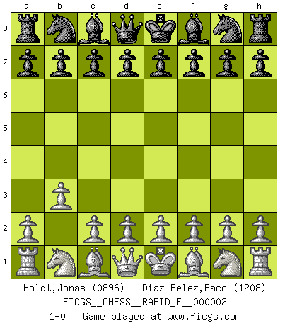 Last move : 1-0 2008 July 2 2:8:3 [Event "FICGS__CHESS__RAPID_E__000002"] [Site "FICGS"] [Date "2008.06.01"] [Round "1"] [White "Holdt,Jonas"] [Black "Diaz Felez,Paco"] [Result "1-0"] [WhiteElo "0896"] [BlackElo "1208"] 1.b3 1-0 This chess game has been lost on time (started : 2008.06.01 16:21:3) Nimzovich-Larsen attack Player White won this chess game. Follow this game move after move (download)The boy (then a 12 year old boy named Anatoly Karpov) doesn't have a clue about Chess, and there's no future at all for him in this profession. (Mikhail Botvinnik) Wenn Du nicht kämpfst, um anderen etwas zu beweisen, sondern nur für Dich selbst, dann bist du fast unbesiegbar. (Garry Kasparov) Si un gobernante no entiende al Ajedrez, ¿como puede governar él un reinado?. (El Rey Khusros II) Même un GMI sait rarement calculer sur plus de cinq coups une attaque à sacrifices. (Rudolf Spielmann) This is where the fun begins. (Anakin Skywalker in Star Wars ep.3)