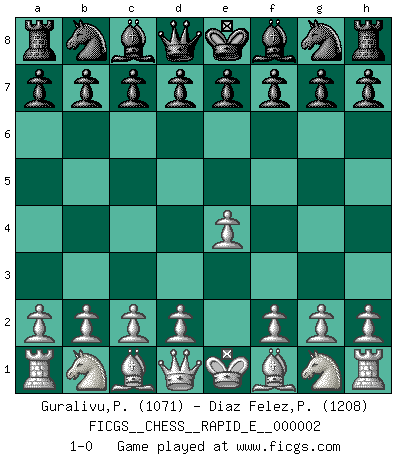 Last move : 1-0 2008 July 2 2:8:3 [Event "FICGS__CHESS__RAPID_E__000002"] [Site "FICGS"] [Date "2008.06.01"] [Round "1"] [White "Guralivu,Paul-Iosif"] [Black "Diaz Felez,Paco"] [Result "1-0"] [WhiteElo "1071"] [BlackElo "1208"] 1.e4 1-0 This chess game has been lost on time (started : 2008.06.01 16:21:3) King's pawn Opening Player White won this chess game. Follow this game move after move (download)Could we look into the head of a Chess player, we should see there a whole world of feelings, images, ideas, emotion and passion. (Alfred Binet) Die größte Kunst beim Schach besteht darin dem Gegner nicht zu zeigen was er tun kann. (Garry Kasparov) Las piezas de Ajedrez son los bloques del alfabeto que moldean los pensamientos; y esos pensamientos, aunque hagan un diseño visual en el tablero, expresan abstractamente su belleza como un poema. (Marcel Duchamp) Botvinnik disait en comparant les échecs à la musique: Il existe une science dont le but est l'étude de l'acoustique et des sons. Mais il y a aussi un art qui se sert de l'océan des sons : c'est la musique. De toute évidence, il en est de même pour la pensée. La logique est l'étude des lois de la réflexion et les échecs reflètent, en tant qu'art, le côté logique de la réflexion, sous la forme d'images artistiques... Extrait de Fischer - Spassky, Reykjavik 1972 par Alexander & F. Wyndham (Ed. Solar), p 37. Programmer - an organism that turns coffee into software. (Anonymous)