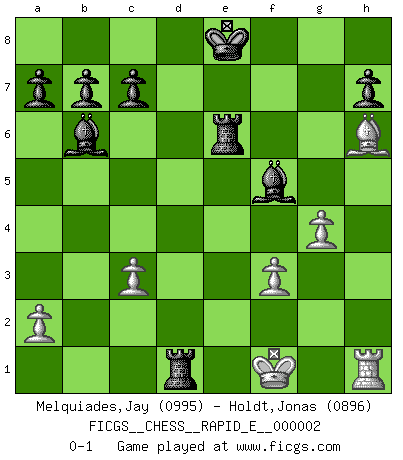 Last move : 0-1 2008 September 7 20:51:59 [Event "FICGS__CHESS__RAPID_E__000002"] [Site "FICGS"] [Date "2008.06.01"] [Round "1"] [White "Melquiades,Jay"] [Black "Holdt,Jonas"] [Result "0-1"] [WhiteElo "0995"] [BlackElo "0896"] 1.e4 e5 2.Nf3 Nc6 3.c3 Nf6 4.d4 exd4 5.Nbd2 dxc3 6.bxc3 Bc5 7.e5 Ng4 8.Ne4 Bb6 9.Bg5 f6 10.exf6 gxf6 11.Bh4 Qe7 12.Bd3 d5 13.h3 dxe4 14.hxg4 exd3 15.Kf1 Bxg4 16.Qxd3 Ne5 17.Nxe5 Qxe5 18.Re1 Qxe1+ 19.Kxe1 Rd8 20.Bxf6 Rxd3 21.f3 Rf8 22.Bg5 Bf5 23.Bh6 Rf6 24.g4 Re6+ 25.Kf1 Rd1+ 0-1 This chess game has been lost on time (started : 2008.06.01 16:21:3) Ponziani : Jaenisch counter-attack Player Black won this chess game. Follow this game move after move (download)Fischer, who may or may not be mad as a hatter, has every right to be horrified. (Jeremy Silman) Ich war schon mal beim Dopingtest. Da musste ich Urin abgeben, während Dritte zusahen. (Elisabeth Pähtz) El juego de Fischer siempre fue nítido, racional y brillante. Uno de los mejores por siempre. (Dave Regis) J'ai vu le vaincu d'Echecs jouer des années durant dans l'espoir de la fête de la victoire. Car tu es plus riche de ce qu'elle existe si même elle n'est point pour toi. Ainsi de la perle du fond des mers. (Antoine de Saint-Exupéry) Computers make it easier to do a lot of things, but most of the things they make it easier to do don't need to be done. (Andy Rooney)