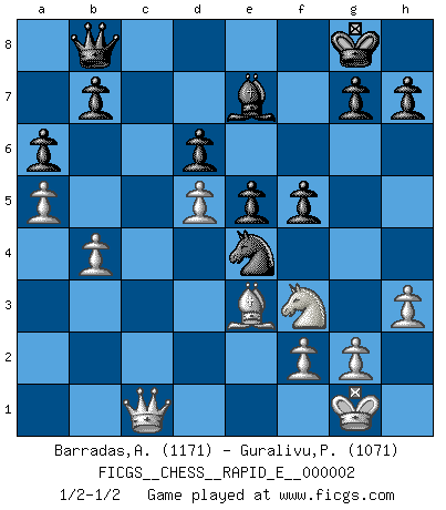 Last move : 1/2-1/2 2008 August 24 3:48:47 [Event "FICGS__CHESS__RAPID_E__000002"] [Site "FICGS"] [Date "2008.06.01"] [Round "1"] [White "Barradas,Anderson"] [Black "Guralivu,Paul-Iosif"] [Result "1/2-1/2"] [WhiteElo "1171"] [BlackElo "1071"] 1.e4 c5 2.Nf3 d6 3.d4 cxd4 4.Nxd4 Nf6 5.Nc3 a6 6.Bd3 e5 7.Nf3 Be7 8.O-O Nc6 9.Be3 O-O 10.Nd5 Be6 11.c4 Bd7 12.a3 Nxd5 13.cxd5 Na7 14.b4 Nb5 15.Qd2 Rc8 16.Rfc1 Rxc1+ 17.Qxc1 Qb8 18.a4 Rc8 19.Qd2 Nc3 20.a5 Bb5 21.Bxb5 Nxb5 22.h3 Nc3 23.Rc1 Nxe4 24.Qb2 Rxc1+ 25.Qxc1 f5 1/2-1/2 Sicilian : Najdorf Kingside Castling by player White (move 8) Kingside Castling by player Black (move 9) This chess game ended in a draw. Follow this game move after move (download)Chess is imagination. (David Bronstein) Wenn es im Universum noch irgendwo intelligente Lebewesen gibt, dann kennen sie Go. (Emanuel Lasker) Los problemas de Ajedrez exigen del compositor las mismas virtudes que caracterizan todo el arte de valor: originalidad, invención, concisión, armonía, complejidad e insinceridad explendida. (Vladimir Nabokov) Une platitude souvent récitée à propos des Echecs est qu'une des choses les plus difficiles à réaliser est de gagner une position gagnante. Cela ne manque pas de sens mais, pour ma part, j'ai toujours trouvé plus difficile de gagner une position perdante. (Tim Krabbe) Go and wake up your luck. (Persian saying)