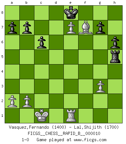 Last move : 1-0 2006 October 3 15:55:36 [Event "FICGS__CHESS__RAPID_B__000010"] [Site "FICGS"] [Date "2006.07.20"] [Round "1"] [White "Vasquez,Fernando"] [Black "Lal,Shijith"] [Result "1-0"] [WhiteElo "1400"] [BlackElo "1700"] 1.e4 e5 2.Nf3 Nc6 3.d4 exd4 4.Nxd4 Nf6 5.Nxc6 dxc6 6.Qxd8+ Kxd8 7.Bg5 Be7 8.Nc3 Be6 9.O-O-O Ke8 10.Be2 Rd8 11.Rxd8+ Kxd8 12.Rd1+ Kc8 13.e5 Nd5 14.Bxe7 Nxe7 15.g3 Nd5 16.Ne4 h6 17.Nc5 Rf8 18.Nxe6 fxe6 19.Bg4 Rxf2 20.Bxe6+ Kb8 21.c4 Rxh2 22.cxd5 cxd5 23.Bxd5 c6 24.Bc4 Rh5 25.Re1 Kc7 26.e6 Kd8 27.e7+ Ke8 28.Bf7+ 1-0 Scotch : Schmidt variation Queenside Castling by player White (move 9) Player White won this chess game. Follow this game move after move (download)A big shock; the best chess player in history has passed away. (Lajos Portisch, about Bobby Fischer's death) Aljechin war kein Nazi. Er war ein Opportunist. Ein schrecklicher Mann. Er liebte Geld über alles und würde für Geld ein Jude, ein Katolik oder ein Protestant werden. (Miguel Najdorf) Preferería tener un Peón que un dedo. (Reuben Fine) Karpov est une pièce de musée. (Garry Kasparov) Those who make the worst use of their time are the first to complain of its brevity. (Jean de la Bruyere)