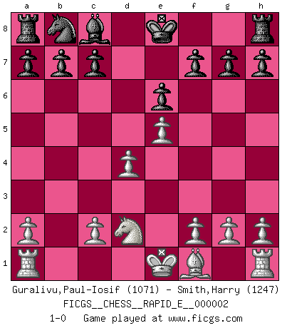 Last move : 1-0 2008 July 15 3:6:42 [Event "FICGS__CHESS__RAPID_E__000002"] [Site "FICGS"] [Date "2008.06.01"] [Round "1"] [White "Guralivu,Paul-Iosif"] [Black "Smith,Harry"] [Result "1-0"] [WhiteElo "1071"] [BlackElo "1247"] 1.e4 e6 2.d4 d5 3.Nc3 Nf6 4.Bg5 Be7 5.e5 Ne4 6.Bxe7 Qxe7 7.Nxe4 dxe4 8.Ne2 Qb4+ 9.Nc3 Qxb2 10.Nxe4 Qb4+ 11.Qd2 Qxd2+ 12.Nxd2 1-0 This chess game has been lost on time (started : 2008.06.01 16:21:3) French : Classical, Tartakower variation Player White won this chess game. Follow this game move after move (download)Chess is no whit inferior to the violin, and we have a large number of professional violinists. (Mikhail Botvinnik) Im Reiche der Wirklichkeit ist man nie so glücklich wie im Reiche der Gedanken. (Arthur Schopenhauer) Todo lo que importa ante el tablero de Ajedrez son buenas jugadas. (Bobby Fischer) Votre seul travail dans les ouvertures est d'obtenir un milieu de partie jouable. (Lajos Portish) Macintosh - we might not get everything right, but at least we knew the century was going to end. (Douglas Adams)