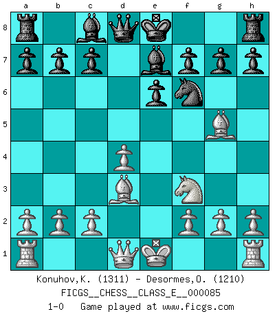 Last move : 1-0 2008 July 17 15:14:18 [Event "FICGS__CHESS__CLASS_E__000085"] [Site "FICGS"] [Date "2008.06.03"] [Round "1"] [White "Konuhov,Konstantin"] [Black "Desormes,Olivier"] [Result "1-0"] [WhiteElo "1311"] [BlackElo "1210"] 1.e4 e6 2.d4 d5 3.Nc3 dxe4 4.Nxe4 Nd7 5.Nf3 Ngf6 6.Nxf6+ Nxf6 7.Bd3 Be7 8.Bg5 1-0 This chess game has been lost on time (started : 2008.06.03 5:54:20) French : Rubinstein variation Player White won this chess game. Follow this game move after move (download)Examine moves that smite! A good eye for smites is far more important than a knowledge of strategical principles. (Purdy) Karpov ist ein Museumsstück. (Garry Kasparov) Una victoria por una combinación errónea, aunque sea espectacular, me llena de horror artístico. (Wilhelm Steinitz) Les échecs, c'est la lutte contre l'erreur. (Johannes Zukertort) Your best chance to get a Royal Flush in a casino is in the bathroom. (Anonymous)