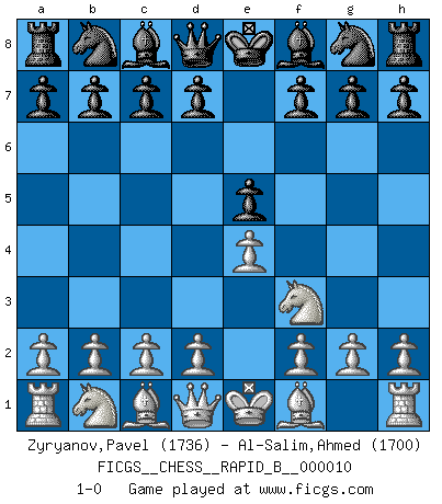 Last move : 1-0 2006 August 25 6:39:27 [Event "FICGS__CHESS__RAPID_B__000010"] [Site "FICGS"] [Date "2006.07.20"] [Round "1"] [White "Zyryanov,Pavel"] [Black "Al-Salim,Ahmed"] [Result "1-0"] [WhiteElo "1736"] [BlackElo "1700"] 1.e4 e5 2.Nf3 1-0 This chess game has been lost on time (started : 2006.07.20 22:39:34) King's knight Opening Player White won this chess game. Follow this game move after move (download)There is no remorse like the remorse of Chess. (H. G. Wells) Ich hatte Angst gegen einen russischen Großmeister zu verlieren, und er befürchtete gegen einen kleinen Jungen zu verlieren. (über ein Remis gegen Juri Awerbach). (Robert James Fischer) Bobby Fischer es el jugador de Ajedrez mas grande que jamás haya existido. (Ken Smith) Le pion, dans sa simplicité, marche droit devant lui, mais lorsqu'il prend, il le fait obliquement? Ainsi l'homme, tant qu'il reste pauvre, marche dans la droiture et vit honnêtement, mais lorsqu'il recherche les honneurs, il flatte, se parjure et, par les voies obliques, cherche une position supérieure sur l'échiquier du monde. (Jean de Galles) The message for business people contemplating their place in the cyberspace is simple and direct: get linked or get lost. (Vic Sussman and Kenan Pollack)