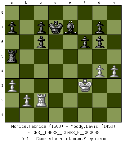 Last move : 0-1 2008 September 27 22:29:4 [Event "FICGS__CHESS__CLASS_E__000085"] [Site "FICGS"] [Date "2008.06.03"] [Round "1"] [White "Morice,Fabrice"] [Black "Moody,David"] [Result "0-1"] [WhiteElo "1500"] [BlackElo "1450"] 1.e4 e5 2.Nf3 Nc6 3.d4 exd4 4.Nxd4 Nf6 5.Nc3 Bb4 6.Nxc6 bxc6 7.Bg5 Qe7 8.f3 d5 9.Bd2 dxe4 10.fxe4 Nxe4 11.Qe2 Nxd2 12.Qxe7+ Bxe7 13.Kxd2 Bg5+ 14.Ke1 Bf5 15.Bc4 O-O 16.Kf2 Bxc2 17.Rhf1 Rad8 18.Rae1 Rd2+ 19.Re2 Rxe2+ 20.Kxe2 Bg6 21.Kf3 Rd8 22.Ne4 Be7 23.Rf2 Rd4 24.Re2 Rxc4 25.Nf6+ Kf8 26.Nd7+ Ke8 27.Ne5 Ra4 28.g4 Ra6 29.a3 f6 30.Nxg6 hxg6 31.h4 Ra5 32.Rc2 Kd7 0-1 Scotch : Schmidt variation Kingside Castling by player Black (move 15) Player Black won this chess game. Follow this game move after move (download)In life, as in Chess, one's own Pawns block one's way. A man's very wealth, ease, leisure, children, books, which should help him to win, more often checkmate him. (Charles Buxton) Zum Sieg gelangt man nicht, wenn man gut, sondern nur wenn man besser spielt (Savielly Grigorievitsch Tartakower) En partidas rápidas, el Caballo es mas poderoso que el Alfil. (Vlastimil Hort) La vérité est comme le meilleur coup aux échecs : elle existe, mais il faut la chercher. (Arturo Perez-Reverte) The weakness of an artist is dogma. (Josh Waitzkin)