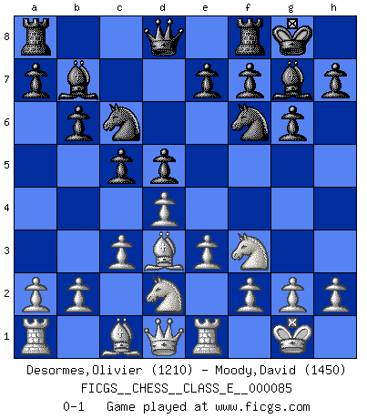 Last move : 0-1 2008 July 16 3:10:42 [Event "FICGS__CHESS__CLASS_E__000085"] [Site "FICGS"] [Date "2008.06.03"] [Round "1"] [White "Desormes,Olivier"] [Black "Moody,David"] [Result "0-1"] [WhiteElo "1210"] [BlackElo "1450"] 1.d4 Nf6 2.Nf3 c5 3.e3 g6 4.c3 b6 5.Be2 Bb7 6.Nbd2 Bg7 7.O-O O-O 8.Bd3 d5 9.Re1 Nc6 0-1 This chess game has been lost on time (started : 2008.06.03 5:54:20) Queen's pawn game Kingside Castling by player White (move 7) Kingside Castling by player Black (move 7) Player Black won this chess game. Follow this game move after move (download)A bad day of Chess is better than any good day at work. (Anonymous) Jeder Fehler erscheint unglaublich dumm, wenn andre ihn begehen. (Georg Christoph Lichtenberg) El sobresalir en el Ajedrez es un signo de una mente intrigante. (Sir Arthur Conan Doyle) L'attaque fait le spectacle, la défense gagne les matchs. (Dicton footballistique) History is a gallery of pictures in which there are few originals and many copies. (Alexis de Tocqueville)